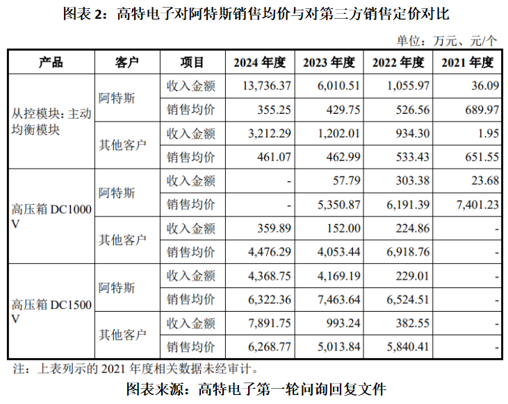 对此,高特电子在第一轮问询回复文件中称,2021—2023年,从控模块中的主动均衡模块产品对阿特斯的销售价格较其他客户的同类产品不存在重大差异情况,伴随阿特斯采购规模逐步增加和公司模块产品的持续降本,产品售价逐年下降,与其他客户趋势一致。2024年,公司对阿特斯的销售价格低于其他客户的销售均价,主要系当年公司对阿特斯的销售还包括部分单价较低的低串数主动均衡模块,拉低了阿特斯的销售均价。
