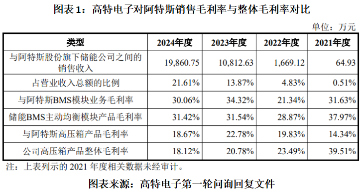 第一轮问询回复文件显示,2021—2024年,高特电子对阿特斯BMS模块业务的销售毛利率分别为31.63%、21.34%、34.32%、30.06%,其中除了2023年,其他年份的销售毛利率均低于其储能BMS主动均衡模块产品毛利率。另外,2021—2022年,高特电子对阿特斯高压箱产品销售毛利率也远低于该公司高压箱产品整体毛利率。