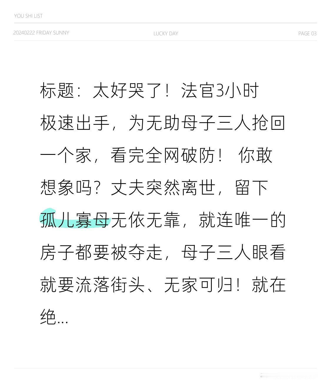 标题:太好哭了!法官3小时极速出手,为无助母子三人抢回一个家,看完全网破防! 你敢想象吗?丈夫突然离世,留下孤儿寡母无依无靠,就连唯一的房子都要被夺走,母子三人眼看就要流落街头、无家可归!就在绝望之际,一位正义法官挺身而出,仅用3个小时,就帮她们守住了最后的港湾,这一幕,暖哭了千万中国人! 这位母亲带着两个年幼的孩子,日子本就过得艰难,顶梁柱一走,整个家瞬间塌了。更让人心寒的是,因为债务和产权纠纷,有人上门要求腾房,要把她们彻底赶出去。寒风里,母亲抱着孩子默默流泪,孩子哭着问:“妈妈,我们要睡大街吗?”小小的身影,看得人揪心不已。 本以为这场房产纠纷会漫长又煎熬,甚至要拖上几个月、一两年,剧情却迎来了最暖心的反转!负责此案的法官得知母子三人的绝境后,没有按部就班拖延,而是立刻启动绿色通道,现场调解、快速核查、多方沟通,争分夺秒与时间赛跑。 从协调矛盾、厘清产权,到敲定方案、保障居住权,整整3个小时,法官没喝一口水、没歇一分钟,硬是用最快速度,保住了这套房子,给了母子三人一个遮风挡雨的家。当母亲听到“房子保住了”这句话时,当场泣不成声,两个孩子也终于露出了安心的笑容。 法律有尺度,更有温度。这位法官守住的不只是一套房子,更是一个家庭的希望,是孩子的童年,是母亲活下去的底气。在最无助的时候,有人为你撑腰,有人为你护航,这就是最踏实的安全感。 这世上最暖的光,是正义的光;最稳的靠山,是守护人民的力量。愿每一个身处困境的人,都能被温柔以待;愿每一份善良与正义,都能照亮人间。 为暖心法官点赞,为这份人间大爱转发!