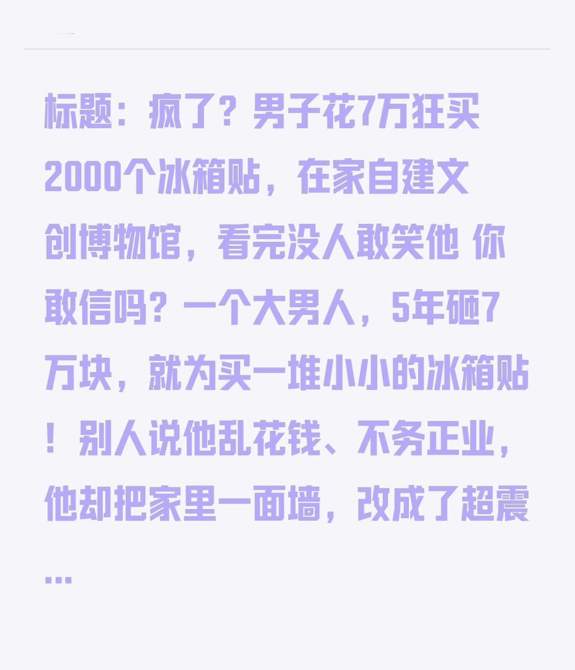 标题:疯了?男子花7万狂买2000个冰箱贴,在家自建文创博物馆,看完没人敢笑他 你敢信吗?一个大男人,5年砸7万块,就为买一堆小小的冰箱贴!别人说他乱花钱、不务正业,他却把家里一面墙,改成了超震撼的私人文创博物馆,2000枚冰箱贴整齐排列,一眼望过去,直接惊艳全网! 一开始,他只是逛博物馆时随手买文创留纪念。慢慢上瘾,从故宫、国博到全国300多家博物馆,只要有好看的文物冰箱贴,他就想方设法收入囊中。便宜的十几块,贵的几百块,日积月累,整整攒了2000多个,花了7万多。家人不理解,朋友不看好,都觉得他在瞎折腾。 反转来了! 当他花24小时把冰箱贴全部上墙,按博物馆、朝代、主题分类摆放,所有人都看呆了。这不是普通小摆件,是红山玉龙、唐三彩、凤冠、兵马俑……方寸之间,装着上下五千年的历史与美学,随手拿起一个,就是一段文物故事。邻居小孩天天来“打卡”,边看边学历史,网友纷纷留言:求开放参观,想问周一闭馆吗? 他说,我不是乱收藏,是把热爱变成了看得见的文化。不用买门票、不用跑远路,在家就能逛遍全国博物馆,这才是最有意义的爱好。 小小冰箱贴,藏着大热爱。有人花钱买烟酒,有人花钱追潮流,而他用自己的方式,守护文化、传递美好。真正的热爱,从不是浪费,而是把平凡日子过成诗。 这面冰箱贴墙,火的不只是创意,更是刻在中国人骨子里的文化自信。愿我们都能守住心中热爱,把普通生活,过得闪闪发光!