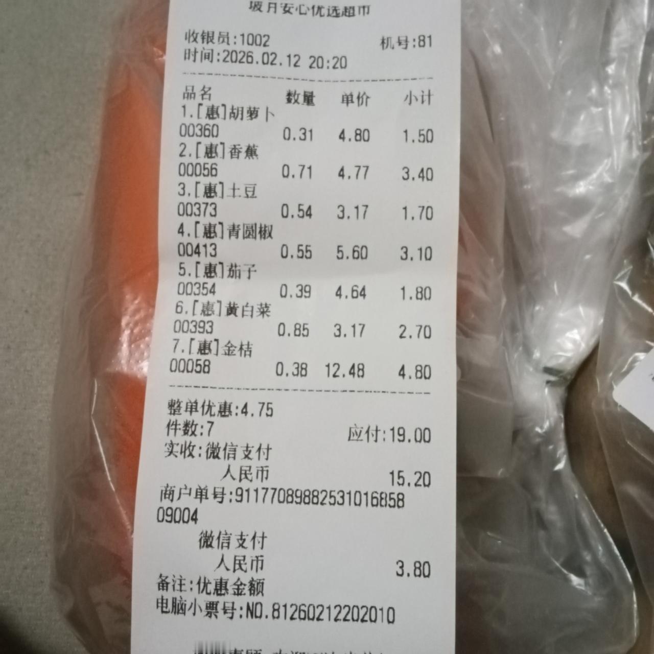 广西巴马康养 春节前夕物价 用一些粉丝朋友的要求给大家介绍一下巴马甲篆镇坡月村当前的物价情况。 今天我们在坡月街世纪养生园门口安馨优选超市买了7种蔬菜水果。 他们分别是胡萝卜,香蕉,土豆,青圆椒,茄子,黄白菜,金桔。 超市规定所有新鲜蔬菜水果19点后全部9折20点后全部8折。 我们就赶在这个时间点采购了以上7种蔬果。 总计金额按照8折计是19元整。再经过当地银行卡支付再度打8折,优惠3.8元。 因此, 七种蔬菜水果总计消费15.2元。[笑][笑] 这够我们至少两个人吃两天的蔬菜和水果,您觉得消费怎么样呢?在寒冷的冬季,我们北方城市的物价与之相比孰高孰低呢?