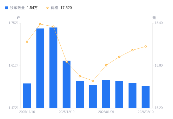日期A股户数(户)流通A股户均持股数(股)户均持股市值(万元)2026-02-101542217118.5329.992026-01-301553016999.4829.552026-01-201558816936.2329.012026-01-091561516906.9428.422025-12-311546217074.2427.712025-12-191559516928.6227.762025-12-101625916237.2827.522025-11-281735715210.1127.792025-11-201732315239.9627.982025-11-101551017021.4030.13