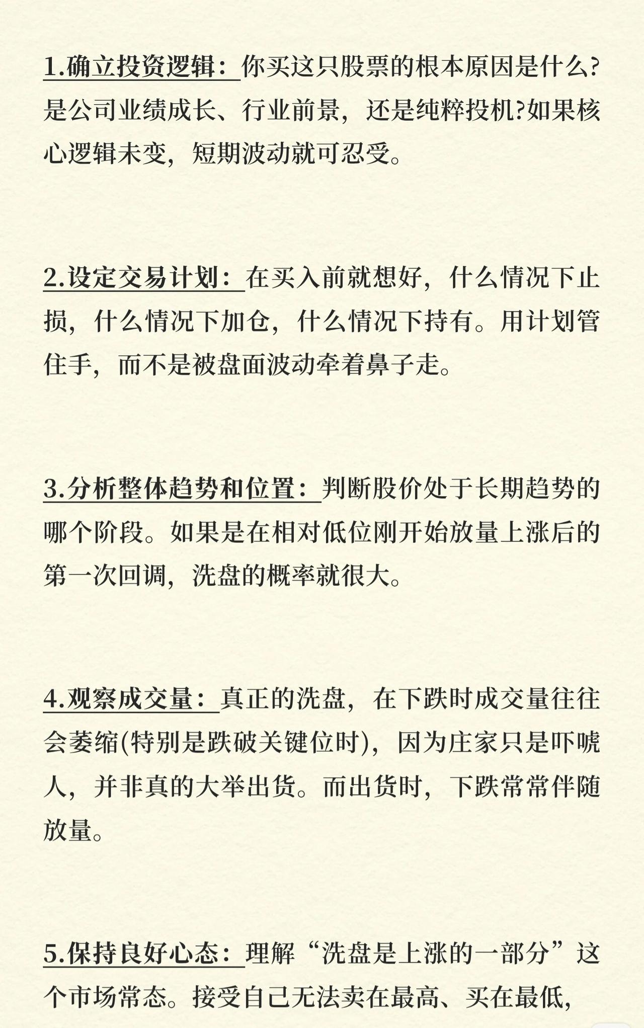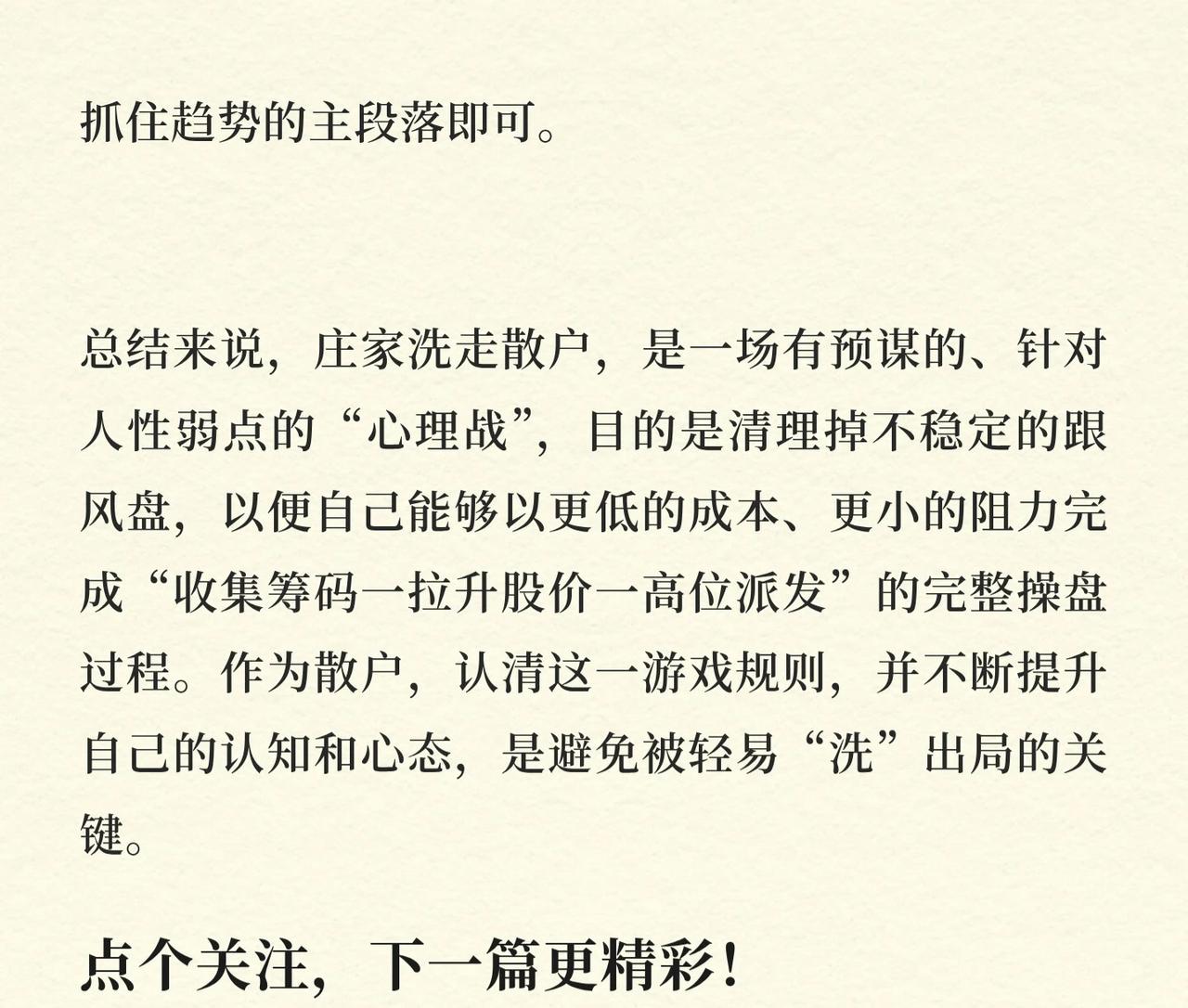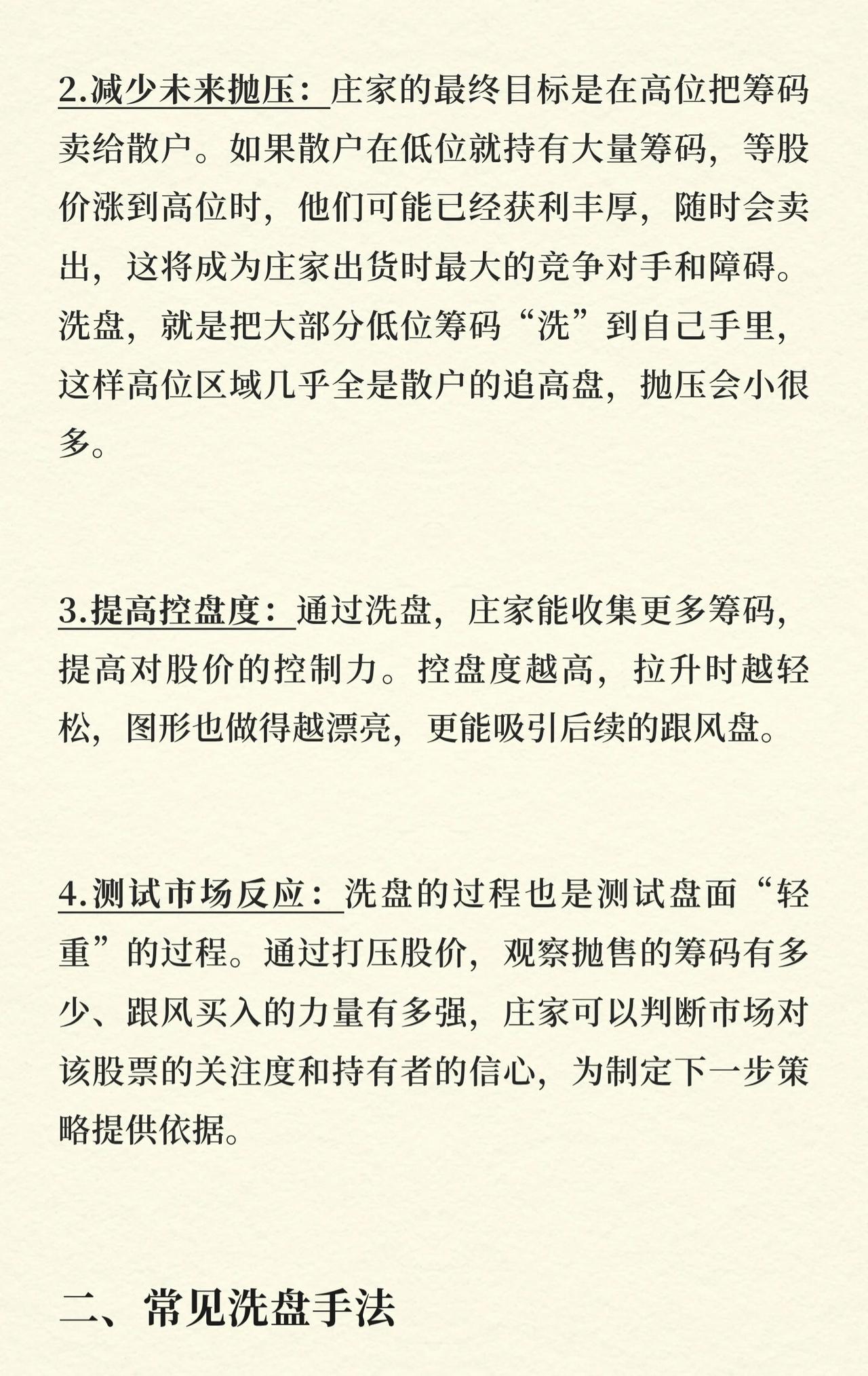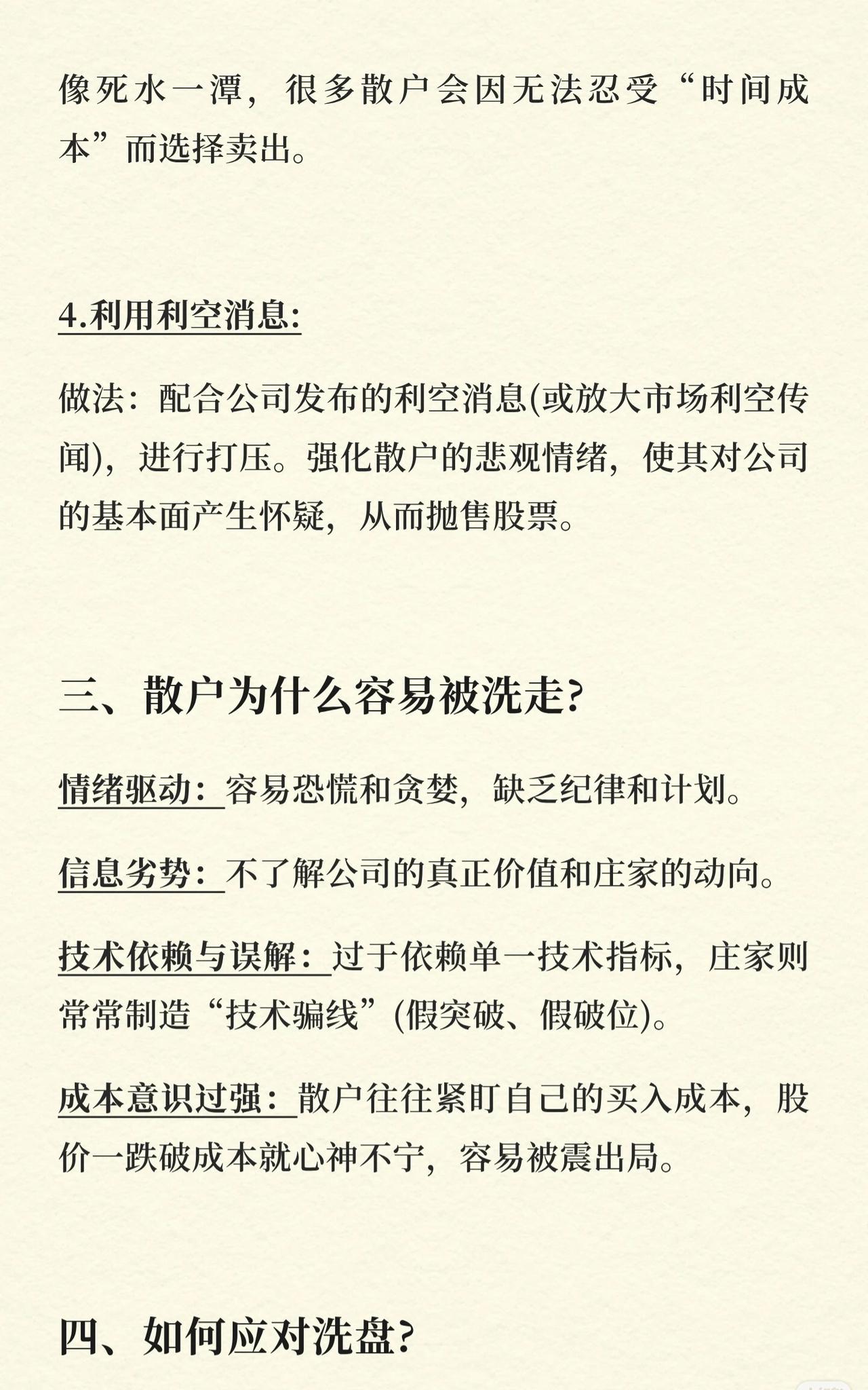 1. 庄家洗散户的目的 - 降低拉升成本:避免散户低位同买推高价格、形成抛压。 - 减少未来抛压:高位时让筹码多在散户手中,便于出货。 - 提高控盘度:收集更多筹码,轻松拉升、吸引跟风。 - 测试市场反应:通过打压看抛售量和买盘力量,调整策略。 2. 常见洗盘手法 - 震荡洗盘:在支撑与压力间反复波动,让散户心态崩溃。 - 打压洗盘:用大卖单砸穿技术位,制造恐慌,逼散户割肉。 - 横盘整理:长期窄幅波动,消磨耐心。 - 利用利空消息:放大负面消息,强化悲观情绪,促使抛售。 3. 散户易被洗走的原因 - 情绪驱动(恐慌、贪婪,无纪律) - 信息劣势(不了解公司价值与庄家动向) - 技术依赖与误解(被假突破/假破位误导) - 成本意识过强(跌破成本就慌) 4. 应对洗盘的方法 - 确立投资逻辑,核心不变可忍短期波动 - 设定交易计划(止损、加仓、持有条件) - 分析趋势与位置(低位首调多为洗盘) - 观察成交量(洗盘缩量,出货放量) - 保持良好心态(洗盘是上涨的一部分) 5. 本质总结 庄家洗散户是针对人性弱点的心理战,目的是清除不稳定筹码,以更低成本、更小阻力完成“吸筹→拉升→派发”过程。散户需认清规则、提升认知与心态,才能避免被洗出局。