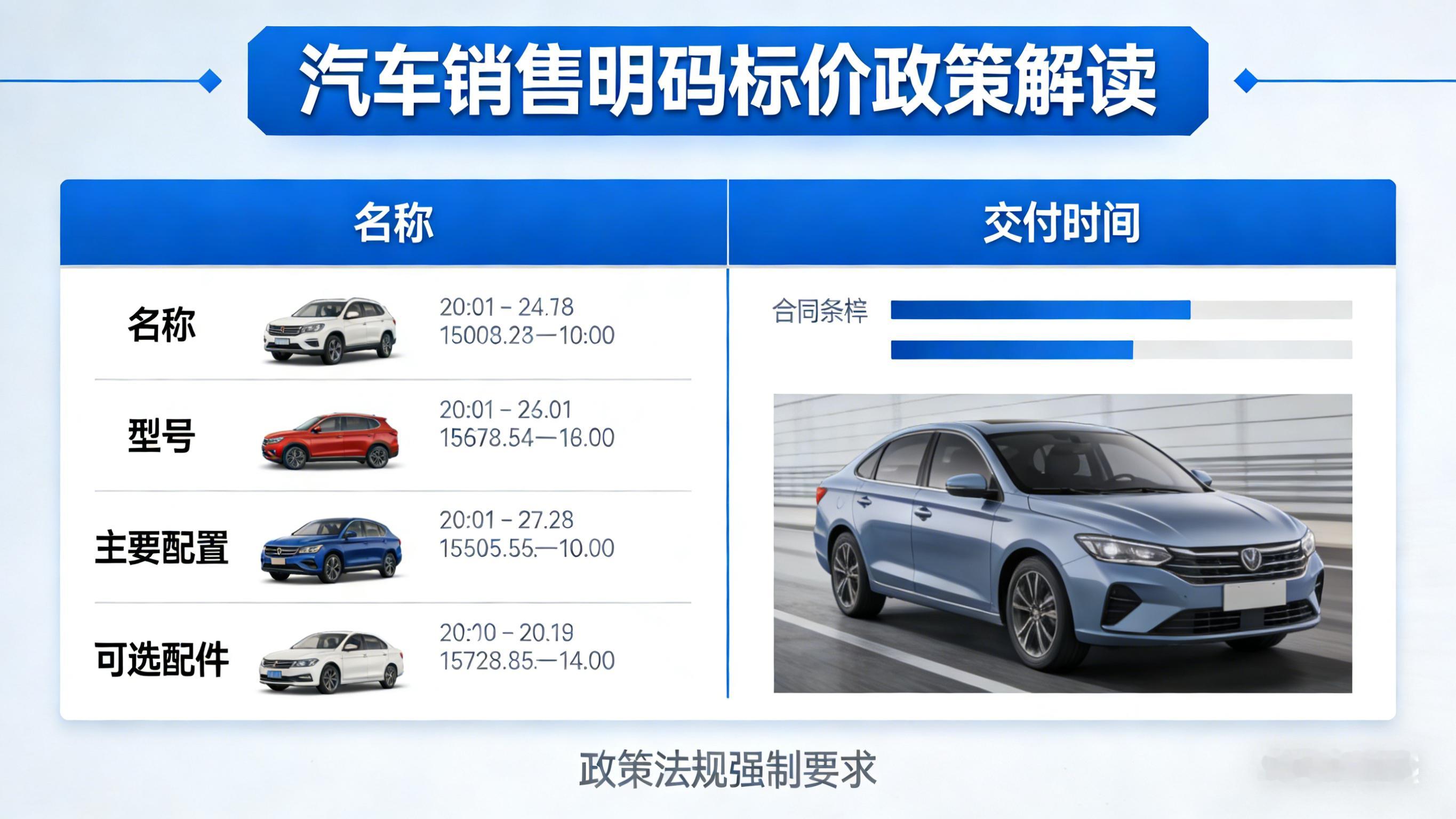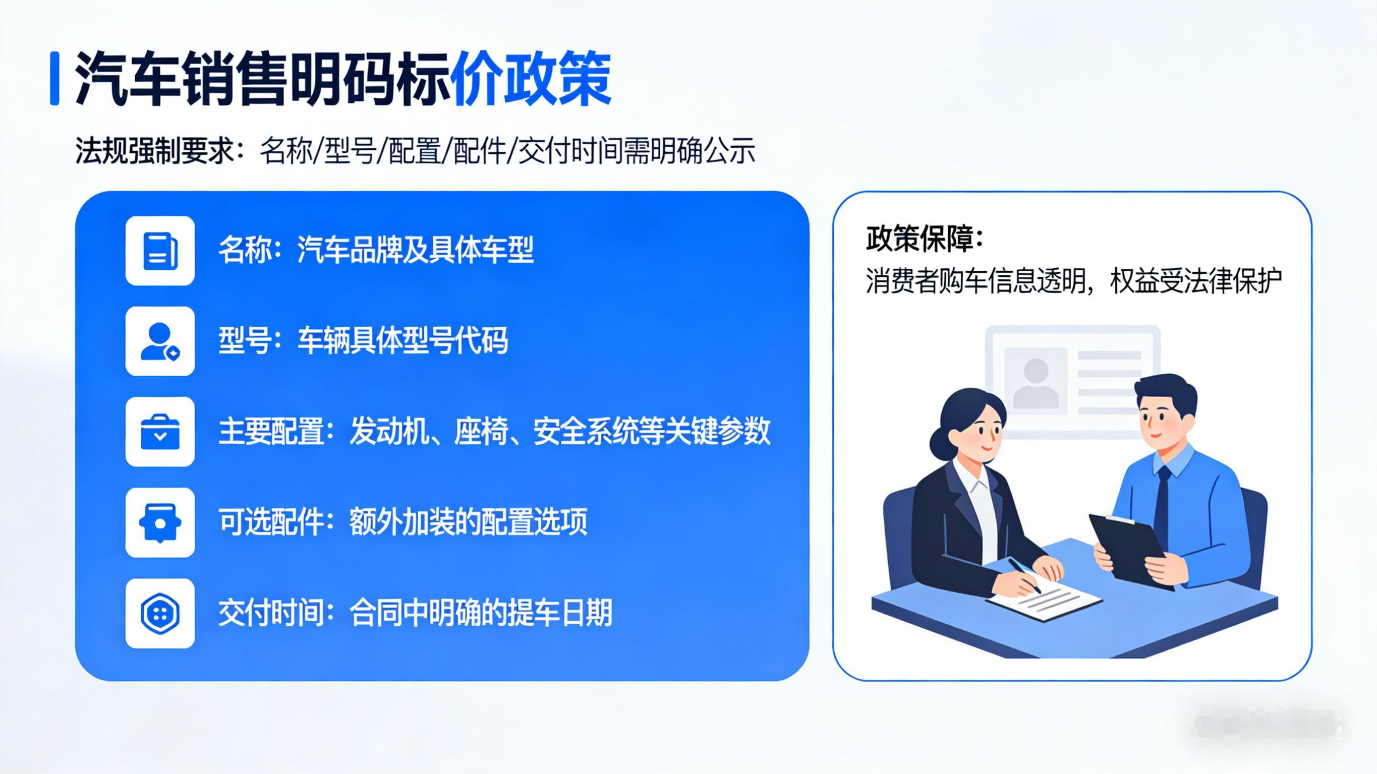 以后大家买车可以更放心了,这也是首次政策面以法规形式强制要求汽车销售必须明码标价,包括名称、型号、主要配置和可选配件等信息都需要明确公示,还有交付时间也会写入合同,这样一来的话,消费者的权益也能得到更好地保障 汽车销售必须明码标价