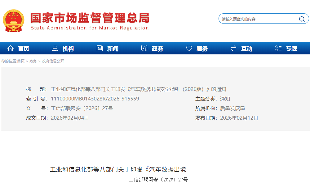 为贯彻落实《中华人民共和国数据安全法》《中华人民共和国网络安全法》《中华人民共和国个人信息保护法》《网络数据安全管理条例》等法律法规,推进数据高效便利安全跨境流动,在国家数据安全工作协调机制统筹指导下,工业和信息化部、国家互联网信息办公室、国家发展改革委、国家数据局、公安部、自然资源部、交通运输部、市场监管总局制定了《汽车数据出境安全指引(2026版)》。现印发给你们,请认真遵照执行。