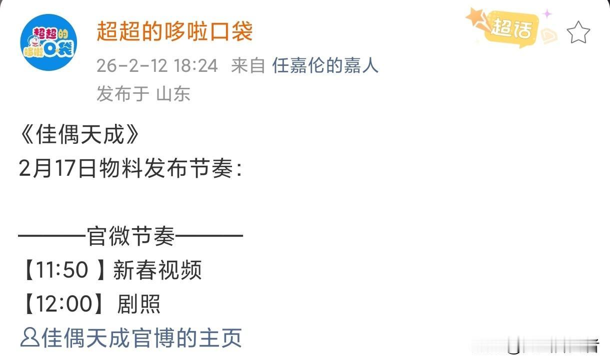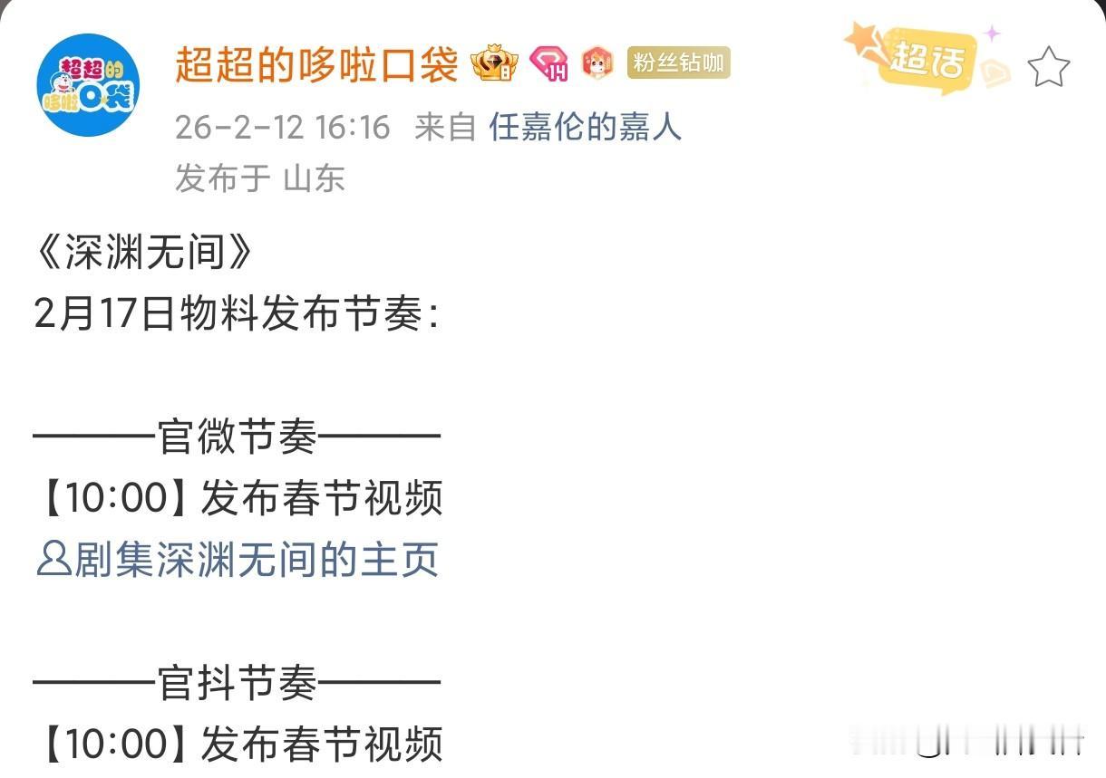 任嘉伦最新消息来袭哦[爱慕][爱慕][爱慕] 根据超超的口袋通知:⬇️⬇️⬇️ 2026年2月17号(农历正月初一) 有任嘉伦的2部待播剧 新物料发布节奏[比心][比心][比心] 1️⃣:《深渊无间》 上午10:00,官微和官抖 同时发布春节视频 2️⃣:《佳偶天成》 上午11:50官微发布新春视频 12:00发布剧照 哇哦,这可真是新年收到最好的礼物了,没有之一,哈哈[大笑][大笑][大笑] 任嘉伦,你也太会了吧[赞][赞][赞] 任嘉伦