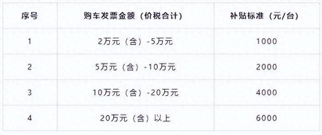 补贴资金以银行卡转账形式发放,按购车发票价税合计金额分为四档,具体标准如下: