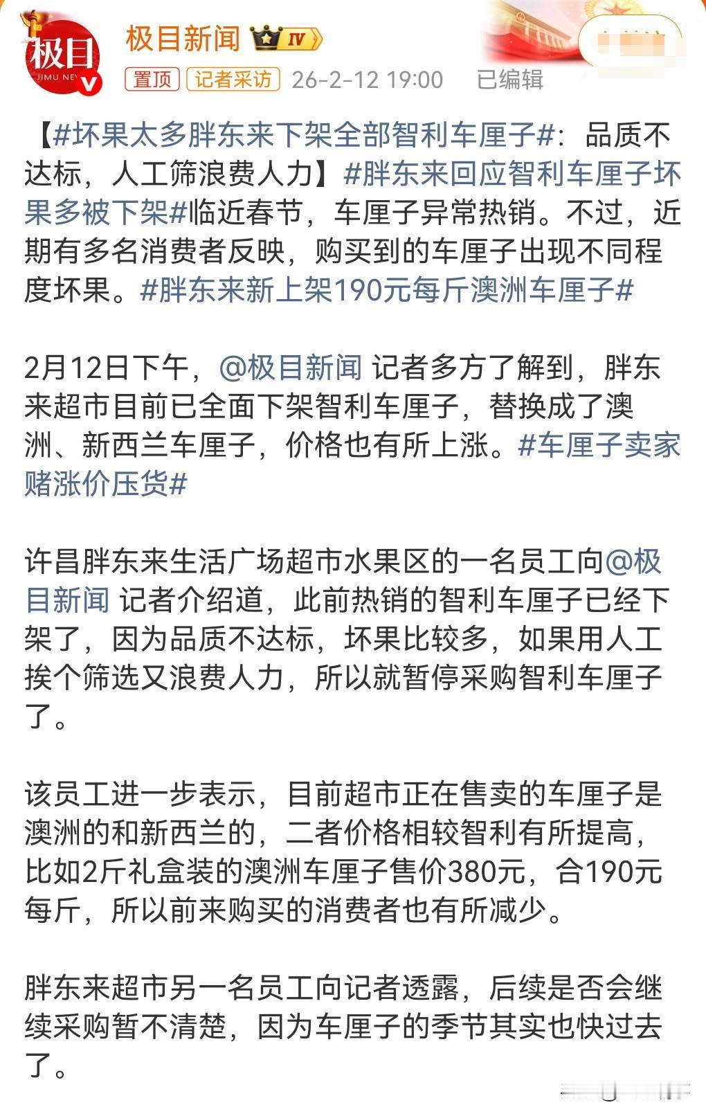 智利车厘子不行了?那其中肯定有人为的因素。 坏果太多,胖东来下架全部智利车厘子。 观点认为那是今年春节来的比较晚,加上有中间商囤货控价导致。 想不到竟然还囤货,这水果讲究的就是一个新鲜,一囤货,那肯定容易变质。如果再卖那真的是太坑人了。 胖东来选择下架,那是明智之举,绝不能让车厘子影响门店的口碑。 胖东来开始实澳洲和新西兰的车厘子,但是价格高的惊人,有种高达190元每斤。 就这个价格足以劝退很多人了。