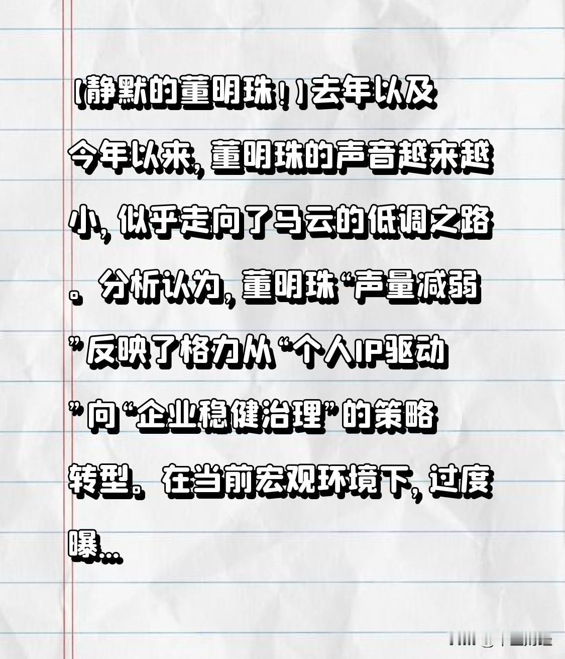 【静默的董明珠!】去年以及今年以来,董明珠的声音越来越小,似乎走向了马云的低调之路。 分析认为,董明珠“声量减弱”反映了格力从“个人IP驱动”向“企业稳健治理”的策略转型。在当前宏观环境下,过度曝光的网红化言论易引发舆情反噬,影响品牌高端化进程及投资者信心。 格力正处于向渠道多元化与多元产业(如预制菜、新能源)突破的关键期,董明珠或正将精力从社交平台转移至内部管理与产业深耕。这种沉默并非消失,而是在经济低波动期采取的一种“避锋芒、务实效”的防御性沟通策略,意在降低品牌与个人言论的强绑定风险。 你认为这种“静默”是因其完成了品牌护城河建设,还是在为下一次重磅决策积蓄声量?还是就此改变了张扬的风格呢?董明珠 格力 董明珠情商 铁汉董明珠 格力女王