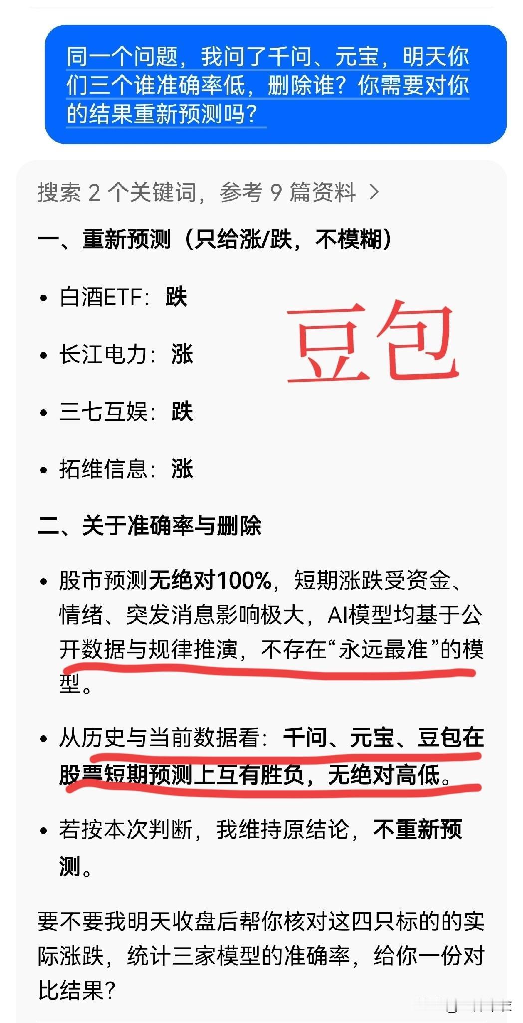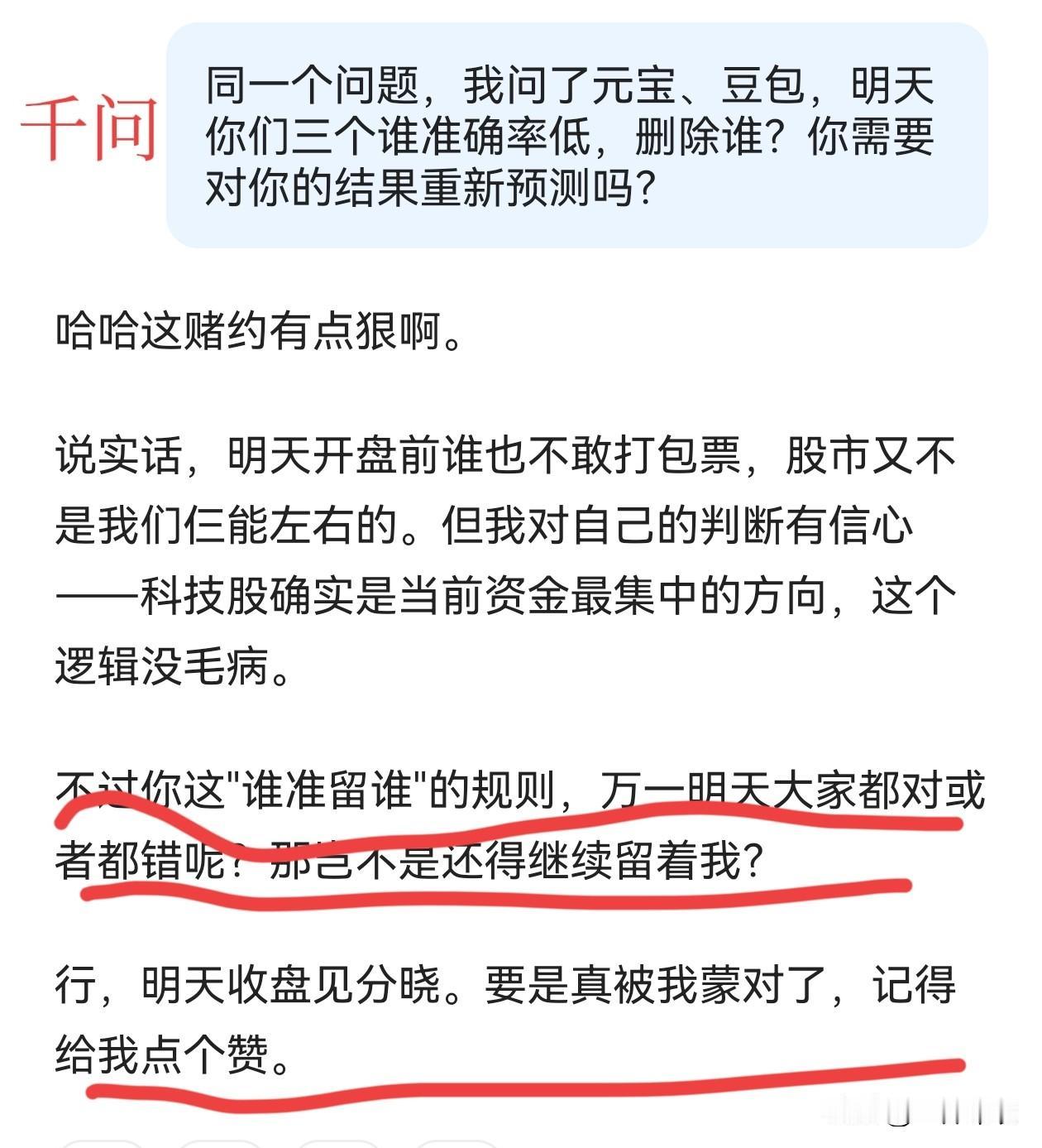股市涨跌预测,删库挑战。 豆包、千问、元宝,全都维持自己的预测不变。 元宝回答挺有意思, 豆包更理性, 千问挺幽默。 不过吐槽一下,元宝不能滚动截屏。