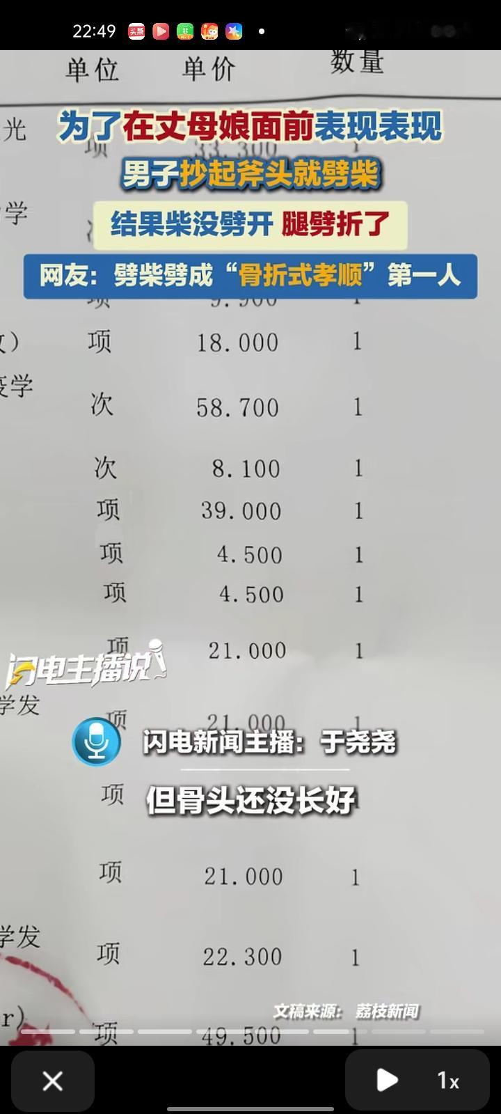近日,黄冈麻城市。男子去丈母娘家,想劈柴好好表现一番,结果打到自己的大腿上导致骨折,现在去医院住院,至今未完全康复。 当事人龚先生表示,当时也是想劈柴表现,自己没有劈柴经验,加之木柴未干透,在水泥地面操作且角度不当,去医院做检查后,打了石膏,目前骨折估计恢复正常,需要几个月,就开开车偶尔走下,拐杖、纱布都已经拆了,呼吁大家返乡不要胡乱图表现。