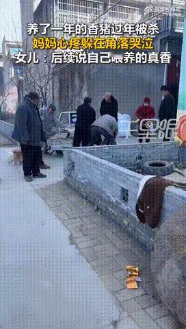 2月8日,安徽亳州。张女士曝养了一年的猪被宰时,妈妈躲在角落抹泪。张女士称,猪是妈妈买回来独自喂养的,就像养孩子一样,杀猪时特别心疼,但是她尝了一口肉忍不住感叹真香。