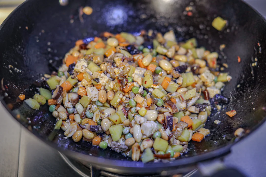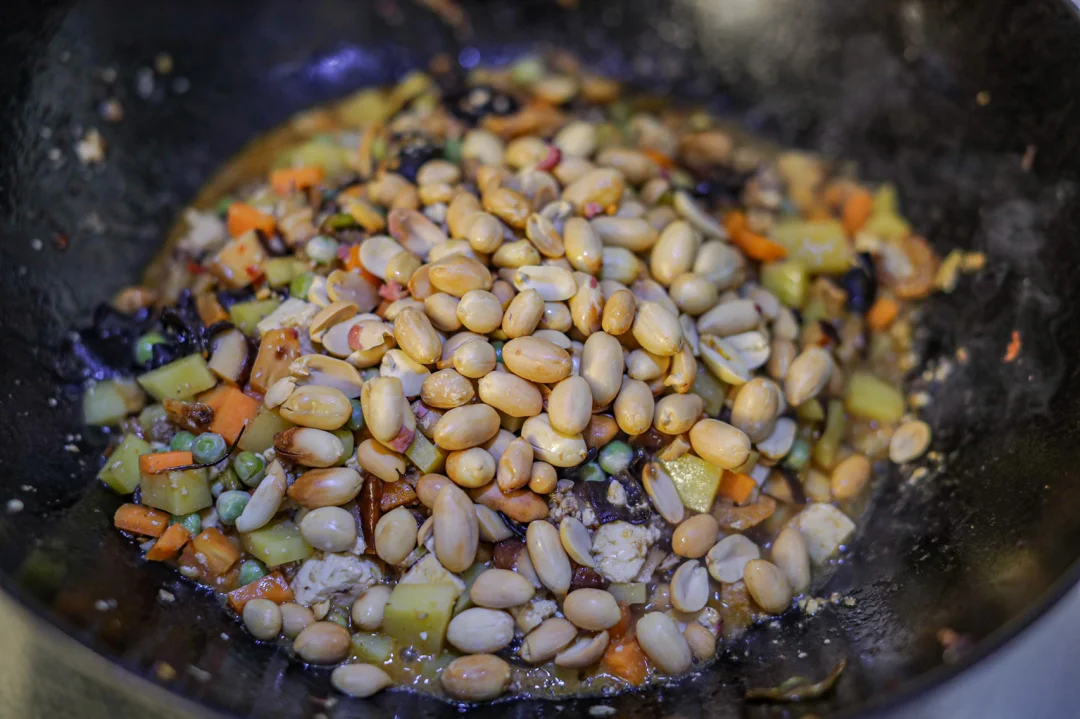 [气球R]6.蔬菜丁和辣肉酱充分融合之后加入花生米,加入少许盐调味。