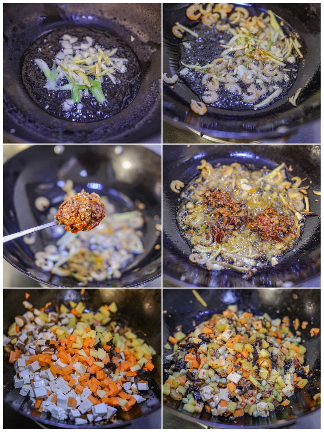 [气球R]1.海米和木耳提前泡发。清洗干净之后切成丁。将土豆、豆腐、胡萝卜同样也切丁。