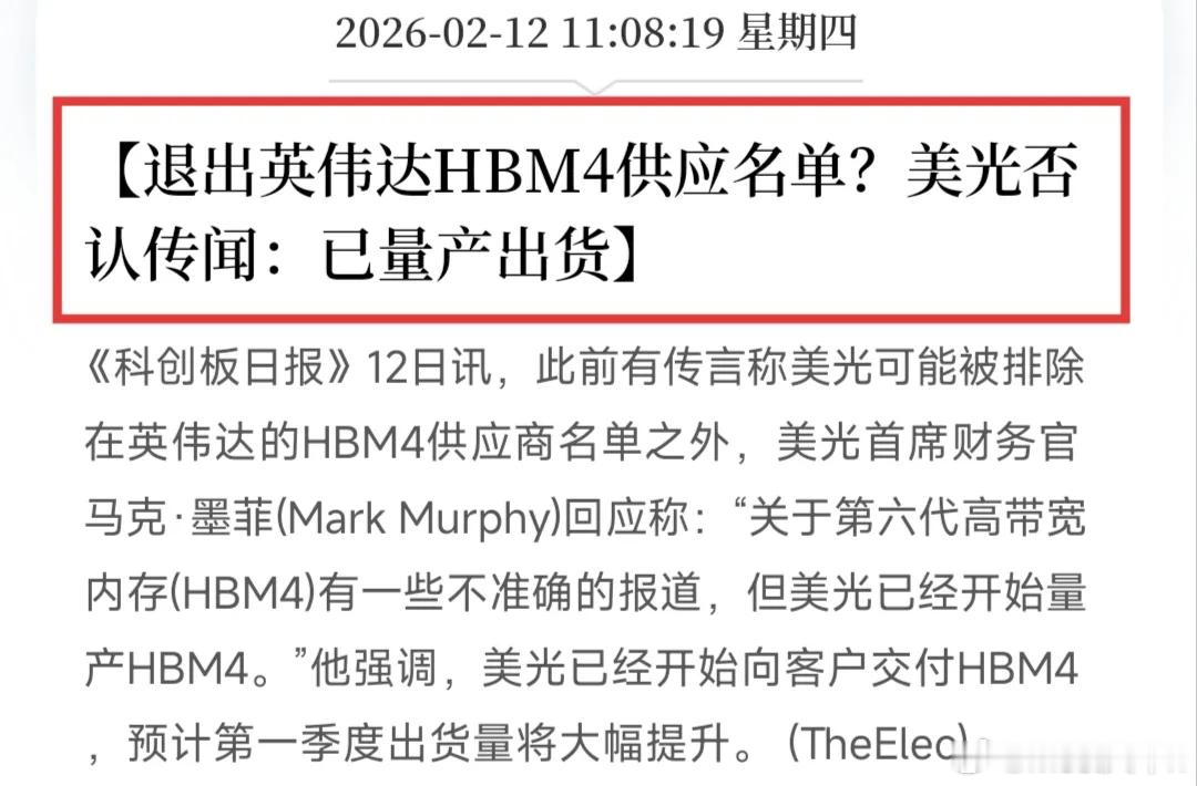 昨天该传闻被辟谣,公司CFO表示:HBM4已经量产,并向客户交付,预计一季度HBM4出货量将大幅增长。