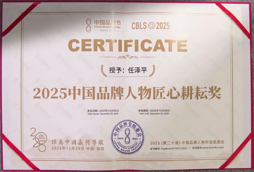 任泽平荣获2025中国品牌人物匠心耕耘奖。由第二十届中国品牌人物年会组委会颁发。