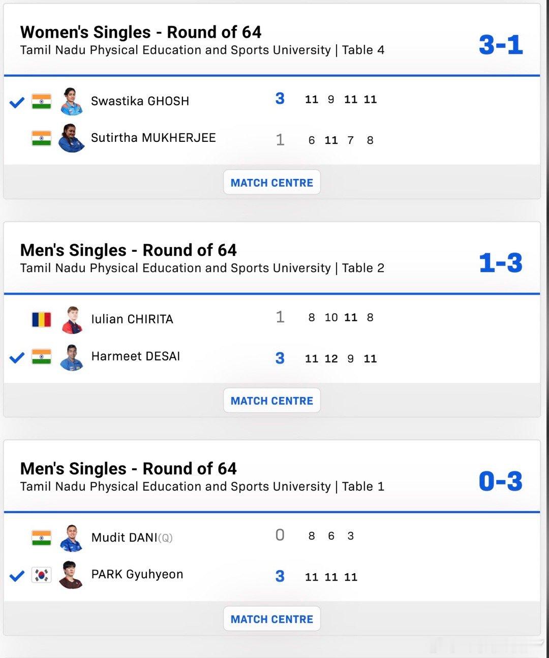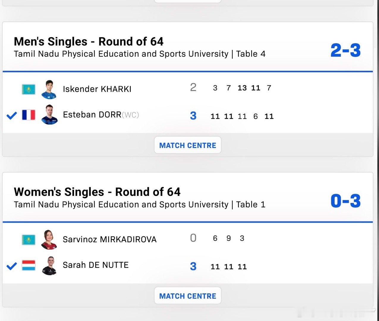 2026wtt金奈球星赛男女子单打64-32德努特3-0米卡迪洛娃斯瓦斯提卡3-1苏提尔塔青木咲智3-0梁夏银德拉古曼3-0赛妮