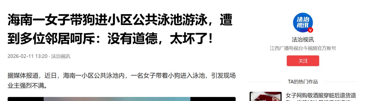 “太不像话了!”海南,一男子到小区游泳池游泳,却发现一名女业主竟然把自家的宠物狗也带进泳池,虽然牵着绳,却在公共的泳池里面给狗狗洗澡,男子看后大怒:当场斥责她:太坏了! 事情要从当天傍晚说起,那时候暑气还没完全消散,天气依旧闷热小区的公共泳池里,像往常一样热闹得像“下饺子”,孩子们套着五颜六色的泳圈,在浅水区欢快地扑腾、打闹,笑声此起彼伏,家长们三三两两地坐在泳池岸边,眼神一刻也不离自家的孩子,一边看着孩子玩耍,一边闲聊,享受着这难得的清凉和亲子时光,整个泳池都充满了惬意的氛围。 可这份和谐,很快就被一个格格不入的身影打破了。一名成年女子,没有像其他业主那样换上泳衣,而是穿着整整齐齐的日常便服,大步流星地闯进了这个满是“湿身”人群的泳池区域,她手里没有拿浴巾也没有带水杯,一只手攥着一根宠物牵引绳,牵着自家的狗,另一只手竟然还提着一根自带的水管,那模样不像是来游泳,反倒像是来做什么私事。 这种视觉上的巨大违和感,本该立刻引起周围人的注意,可谁也没想到,接下来发生的一幕,更是直接挑战了在场所有人的认知底线,让人难以接受,女子径直走到泳池浅水区的边缘,旁若无人地把自家的宠物狗牵到水边,然后熟练地接通了泳池边的水管,拧开阀门,竟然就这么就地,把小区的公共泳池,当成了自家的私家澡堂,开始给狗狗洗澡。 水花四溅带着狗狗身上的皮屑、浮毛,顺着水流迅速扩散到泳池里,原本清澈的池水,瞬间变得有些浑浊,更让人恶心的是,那些肉眼可见的狗毛碎渣,随着泳池里的波浪,漂到了旁边正在嬉戏的孩童身上,孩子们不知情,还在水里打闹,看得旁边的家长心里一阵发紧。 那一刻热闹的泳池陷入了一种诡异的安静,像是所有人都患上了“集体失语症”,周围的家长们,脸上全都写满了厌恶和不满,有人皱着眉头,赶紧把自家的孩子往泳池深处拉,生怕孩子接触到那些脏东西,有人凑在一起,小声嘟囔着,发泄着心里的不满,可奇怪的是,竟然没有一个人敢站出来,直接制止女子的行为。 这就是典型的“沉默螺旋”,大家心里都有气却都在等,等着别人先出头,谁也不想做那个在公共场合撕破脸皮的“刺头”,也不想惹麻烦,于是女子这种毫无底线、侵犯公共利益的行为,就在数百双眼睛的注视下,荒诞地持续着,泳池里的水也变得越来越脏。 就在这时一位刚换好泳衣、兴致勃勃准备下水游泳的男业主,走到了泳池边。他本来满心期待着能泡在泳池里,缓解一下一天的疲惫和闷热,可映入眼帘的,不是预想中碧波荡漾的池水,而是女子给狗洗澡的荒诞闹剧,水里漂浮的狗毛和皮屑,更是让他瞬间没了兴致,取而代之的是一阵反胃和怒火。 和其他人选择默默撤退、忍气吞声不同,这位男业主没有丝毫犹豫,直接冲到了那名女子面前,指着那只浑身湿漉漉、还在不停甩动毛发的狗,压抑着心里的怒火,当场斥责了她,语气里满是气愤:“太坏了!太不像话了!” 这句话虽然不文雅,也没有什么高深的道理,却像一把利刃,瞬间切开了现场令人窒息的沉默,说出了在场所有人的心声,成了那一刻,所有人的“嘴替”。 可让人没想到的是,面对男子如此直白的指控和斥责,那位女业主不仅没有丝毫歉意,没有停下给狗洗澡的动作,反而理直气壮地反驳,展现出了一种令人咋舌的扭曲逻辑。她觉得,自己家的狗定期驱虫、打疫苗,很干净,根本不会有什么问题,是大家小题大做,没必要这么较真。 在她的认知里,只要自己觉得狗干净,就可以把自家客厅的卫生标准,强行套用到小区的公共泳池里,却忘了公共泳池是所有业主共同使用的公共空间,不是她自家的私家澡堂。 她根本没有意识到,就算狗定期驱虫,身上也依然会有肉眼看不见的细菌和寄生虫卵,单是那些漂浮在水面上的狗毛和皮屑,对于免疫力尚未发育完全的儿童来说,就是实打实的过敏源和致病隐患,很容易让孩子生病。 小区物业得知情况后,反应还算迅速,连夜组织工作人员,将泳池里的脏水全部排空,对泳池进行全面的深度消杀,之后又重新注水,花费了大量的水费和人力成本。 没过多久泳池边就竖起了一块崭新的标识牌,“宠物禁入”,这不仅是物业弥补管理漏洞的举措,更是《民法典》中,关于饲养动物不得干扰他人生活这一规定的具象化体现。 所谓文明,说白了就是一种分寸感,知道哪里是自家的私人空间,哪里是大家共同的公共空间,懂得尊重他人、遵守公共规则,这本该是成年人最基本的必修课,可这名女子,显然没有学会。