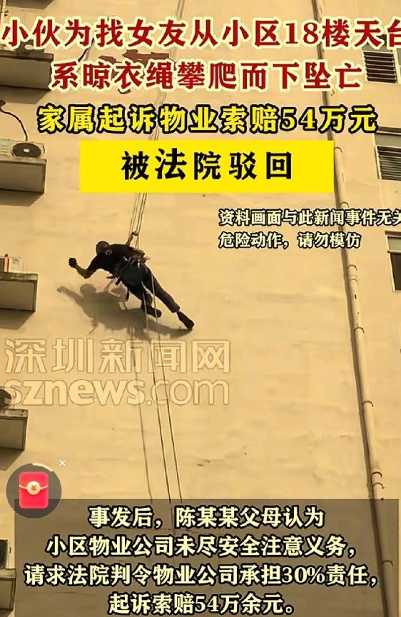 浙江宁波,24岁男子为了寻找女友,跑到其小区,从18楼顶楼天台,捡条尼龙绳绑身上从楼顶“空降”,谁知绳子断了,瞬间坠落,人当时就没了,男子父母悲痛欲绝,事后,告上法院,索赔54万,理由是物业未尽到安全注意义务,法院判决让人痛快。 可陈某却偏偏不走寻常路,他的大脑像是在那一刻“短路”了一样,直接略过了所有正常的社交方式,径直走进小区,按下了电梯的18楼按钮。 电梯平稳抵达顶楼后,他没有丝毫犹豫,直接走向了天台,全程动作行云流水,却处处透着诡异,他此行的目的,从来都不是欣赏顶楼的风景,而是盯上了天台之上,那一排排业主们用来晒被子、晾衣服的尼龙绳。 那些尼龙绳,就是最普通的晾衣绳,原本的使命就是在阳光下挂几件衣服、晒几床被子,没有任何安全认证,更没有人会想到,有人会用它来承载一个成年男性的体重。 可陈某却毫不在意,随手从上面解下一根,一头匆匆系在天台的管道上,另一头紧紧勒在自己的腰间,简单固定后,就当成了“救生索”,准备靠着这根脆弱的绳子,从18楼天台“空降”下去,直接敲女友的窗户。 其实天台边缘有一道高度在1.25米到1.26米之间的防护墙,这个高度,完全符合国家防跌落的相关标准,足以拦住一个意外失足的孩子,就算是成年人不小心踉跄一下,也能起到防护作用。 可这道防护墙终究挡不住一个铁了心要翻越的人,陈某轻易就翻了过去,双手抓着管道,身体靠着那根尼龙绳,试图一点点往下挪动,上演一场现实版的“空降兵”。 悲剧,就在他挪动的瞬间,毫无预兆地发生了脆弱的尼龙纤维,根本承受不住一个成年男性的体重,再加上重力加速度的撕扯,绳子瞬间崩断,没有任何缓冲,陈某从18层的高空直坠而下,重重砸在楼下冰冷的水泥地上。现场十分惨烈,陈某当场就没了生命迹象,经检查,他受了严重的开放性颅脑损伤,心跳呼吸骤停,没有任何抢救的可能。 随后陈某的父母接到消息,匆匆赶到现场,看到儿子冰冷的尸体,夫妻俩悲痛欲绝,哭得当场昏厥过去,那种白发人送黑发人的痛苦,让人看了心生同情,可谁也没想到在痛失爱子之后,陈某的父母竟然做出了一个让人意外的决定,将小区物业告上了法庭,向物业索赔死亡赔偿金、丧葬费等各项费用共计54万余元,他们给出的理由,是物业没有尽到安全注意义务。 他们的想法很简单也很偏执,如果小区天台的门锁上了,他们的儿子就上不去天台,自然就不会发生这样的悲剧,如果物业管理到位,及时制止这种危险行为,或者消除安全隐患,悲剧也能避免。 基于这样的逻辑,他们认为物业应该承担30%的责任,赔偿他们相应的损失,这其实也是很多同类案件中,家属的惯性思维,只要人在你的地盘出了事,你就必须掏钱,哪怕只是出于所谓的“人道主义”。 可这一次小区物业并没有选择“花钱消灾”,而是拿出了充分的证据,坚定地维护自己的权益,物业表示,天台通道属于消防逃生的生命通道,根据相关法律规定,高层民用建筑的疏散通道、安全出口应当保持畅通,禁止锁闭出口,所以天台的门不能上锁,一旦上锁发生火灾等紧急情况,就会危及全楼居民的生命安全,这是法律的强制要求。 除此之外物业还拿出证据证明,天台的防护墙高度完全符合国家防跌落标准,足以起到防护作用,那根惹祸的尼龙绳,是业主自行放置的生活用品,并不是小区原生的安全隐患,而且天台的显眼位置,早就张贴了黄色的“禁止攀爬,危险”警示标识,提醒居民注意安全。物业已经做了所有法律要求、自己能做的事情,尽到了应尽的安全注意义务,不应该承担任何责任。 最终法院做出了判决,这个判决让很多人都觉得痛快又解气,驳回陈某父母的全部诉讼请求,小区物业无责,这个“零赔偿”的判决,看似冰冷,实则守住了规则的底线,也斩断了“谁弱谁有理”“死者为大就必须赔钱”的索赔惯性,给所有成年人都敲了一记警钟。 我们同情生命的逝去,也理解陈某父母失去儿子的痛苦,但法律是公平公正的,不能为个人的疯狂和无知买单,在这个世界上有些错误,有些代价,终究只能由自己承担。