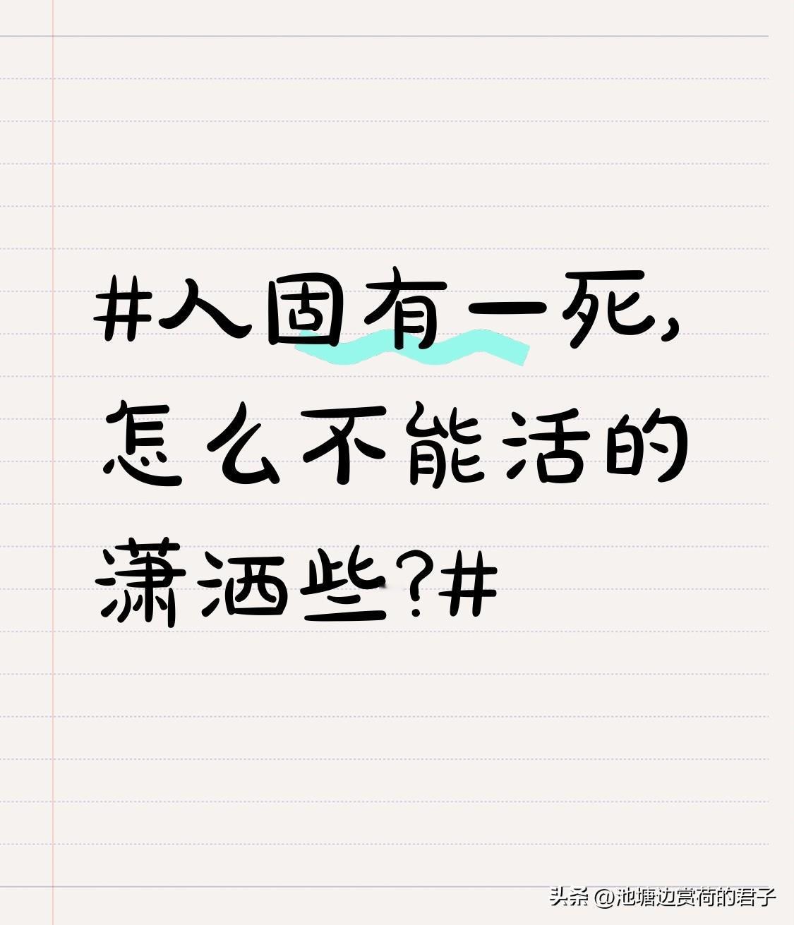 人固有一死,怎么不能活的潇洒些? 人固有一死,当然要活得潇洒些!别被道德绑架束缚,那些善解人意的人往往最憋屈,会哭会闹的却有糖吃。别总盼着别人理解,伤害你的人心里门清。 别在烂人烂事上浪费时间,每天能自由掌控的不过五小时,这可是决定命运的关键。也别太在意外界的评价,为一句闲言、一点小利争得头破血流太傻。 身材、气质、人缘、事业好,都源于自律,自律是为了成就更好的自己。放下执念,轻装简行,像闲看花开落、坐观云卷舒一样潇洒生活。