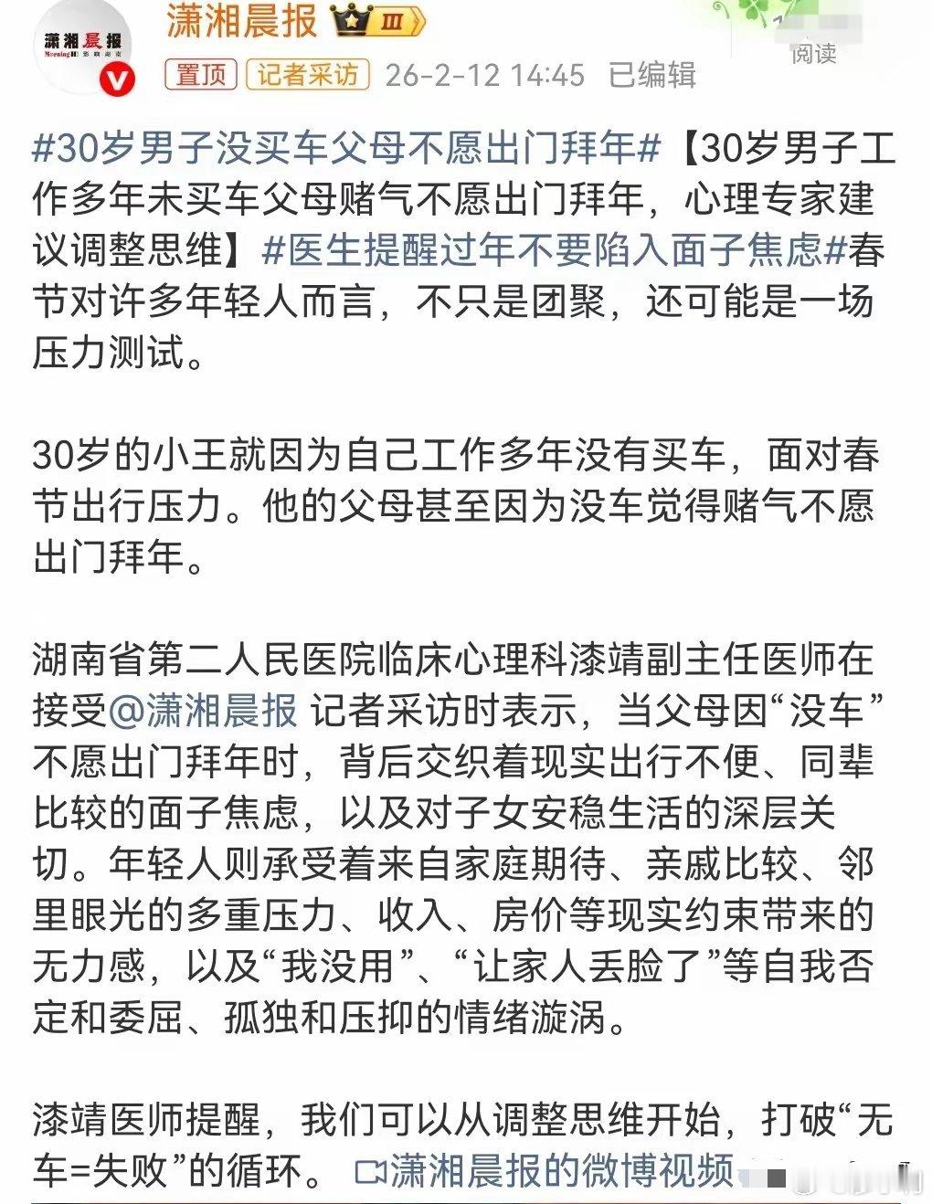 30岁男子没买车父母不愿出门拜年我也是农村出来的,我很理解这位男子父母的心态。父母不愿出门其实是怕儿子被别人看不起。现在农村攀比风气非常严重,过年村里人都回来了,大家走到一起就是各种攀比,比收入、比房子、比车子、比烟的档次,这些比不过,就比谁结婚早,总得想方设法压人一头。真心觉得没必要,日子是过给自己的,为了面子折腾,累的还是自己啊。热点观点