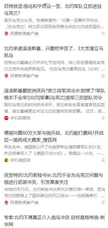 北约军队下场俄乌战争,意义不大了,可以说,俄乌战争打到现在。北约也已经很明白了,北约军队下场参战,结果就只有两个。第一个,干脆打不过,第二个,还是继续僵持继续消耗战。 麻烦看官老爷们右上角点击一下“关注”,方便您进行讨论和分享,感谢您的支持! 俄乌战争打到现在,北约已经看得很明白,就算直接派军队下场参战,也改变不了大局,结果只会有两种:要么干脆打不过,要么就是继续陷入漫长的消耗战,没有第三条路可走。 截至 2026 年初,北约通过三年多的战场观察与实战复盘,已经得出清晰结论,其常规军事力量直接介入俄乌冲突,仅会出现战败或长期僵持两种结局,这也是北约始终不敢正式派兵的核心原因。 2022 年冲突刚爆发时,北约曾预判这会是一场快速结束的有限冲突,俄军会很快陷入被动。但从 2022 到 2024 年,战场形势完全反转,战争逐步演变成持久战、消耗战,俄军的战术打法、电子战与防空能力不断升级,逐步掌握战场主动权。 德国军事专家弗朗兹 - 斯蒂芬・加迪多次公开分析指出,北约传统依赖的空中优势与远程精确火力战术,在俄乌战场已经失效,面对俄军完善的防空体系与电子对抗能力,北约就算亲自上阵,也很难取得决定性胜利。 2024 年 7 月北约华盛顿峰会期间,美国联合德国、荷兰等国承诺向乌克兰提供 5 套 “爱国者” 防空系统,强化乌方防空能力,但峰会文件与各国官方表态均明确,不会向北约派遣任何地面作战部队。 这场战争彻底暴露了北约的战术短板,其擅长的快速突击、空中压制在俄军面前难以施展,而长期地面消耗战正是北约国家不愿承担、也难以承受的战争模式。 北约内部对出兵的分歧也越来越大,东欧国家主张强硬对抗,德法等西欧国家则顾虑战争外溢与经济代价,始终无法形成统一的出兵共识,只能停留在对乌援助层面。 2026 年 1 月,美俄双方就俄乌冲突草拟和平框架计划,核心内容包括冻结当前交战战线、明确乌克兰不加入北约,同时北约方面主张对乌克兰军队规模进行严格限制,推动冲突降温。 从全力援乌到推动和谈、限制乌军规模,北约的态度转变,本质上是认清了战场现实,知道直接参战无利可图,只会让自身陷入更大的安全与经济风险。 综合战场态势、军事评估与政治考量,北约已经没有任何动力和理由直接派兵介入俄乌冲突,继续援助、推动谈判、避免直接对抗,成为其当前最理性的选择。 俄乌冲突的走向已经证明,现代化高强度地面消耗战,并非北约的强项,强行下场只会带来更大损失,这也是北约始终守住 “不直接参战” 红线的根本原因。