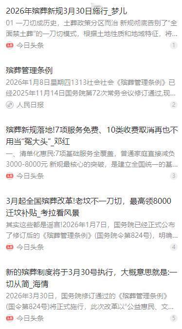 新的殡葬制度将于 2026 年 3 月 30 号执行,大概意思就是:一切从简,城里可以选火葬,山区可以选土葬,但是要进公墓,想搞树葬花葬的国家还给发钱。以后火化、运输这些基础服务,要么免费要么全国统一价,价格摆在明面上,谁也别想钻空子。 麻烦看官老爷们右上角点击一下“关注”,方便您进行讨论和分享,感谢您的支持! 2026 年 3 月 30 日,新修订的《殡葬管理条例》将在全国正式实施。这是我国近三十年来殡葬领域最全面的一次改革,核心目标就是简化丧葬流程、规范服务价格、减轻普通家庭的经济负担,让殡葬事业真正回归公益属性。 新规最大的变化,就是把殡葬服务的公益属性放在首位,彻底整治行业内存在的乱收费、高收费、隐形消费等问题。今后,遗体接运、遗体存放、遗体告别、火化、骨灰寄存等群众必需的基础服务,都会纳入统一清单管理。 这些基础服务不再由市场随意定价,而是实行政府定价或者政府指导价,所有收费项目和标准都必须向社会公开,明码标价。任何机构都不能在清单之外增设项目、违规收费,从制度上堵住牟利空间,让老百姓办丧事明明白白消费。 在安葬方式上,新规不再采取一刀切的做法,而是结合各地实际情况分类施策。城市以及人口稠密、耕地紧张的地区,统一实行火葬,保护土地资源和生态环境。 在条件适宜的山区农村,划定为土葬区的地方,居民可以选择土葬,但必须严格遵守管理规定。所有土葬都要进入政府统一规划建设的公益性公墓,不允许私埋乱葬、占用耕地、林地,也不允许修建超大墓穴、豪华墓地。 为了推动绿色环保、节约土地,新规大力倡导树葬、花葬、草坪葬、骨灰撒散等生态安葬方式。这些安葬方式不占地或少占地,有利于生态保护,国家明确支持,地方政府会给予相应的补贴或奖励,引导群众转变传统观念。 生态安葬既符合现代文明理念,也能切实减轻家庭的安葬成本,同时减少土地资源消耗。随着补贴政策落地,选择绿色安葬的家庭会越来越多,逐步形成文明节俭办丧事的社会风气。 针对特殊困难群体,新规也做了专门安排。对城乡低保对象、特困人员、困难残疾人家庭等,地方政府会按照规定落实殡葬救助保障,确保困难群众基本丧葬需求得到兜底保障,不会因为经济问题影响身后事妥善办理。 同时,新规也覆盖到流动人口群体,保障外来务工人员、异地就读学生等在常住地办理基本殡葬服务,享受相应的减免政策。异地殡葬服务更加便利,打破地域限制,体现公共服务的公平性与普惠性。 新规还对殡葬设施建设做出严格规范,今后殡仪馆、公益性公墓等以政府投资为主,坚持公益定位,不得商业化运作。从建设、运营到管理,全链条突出公益属性,避免资本过度介入,保障服务质量与收费合理。 在丧事活动方面,新规倡导文明节俭,反对大操大办、铺张浪费、封建迷信。鼓励简化仪式、理性治丧,既尊重传统习俗,又符合现代社会文明要求,减轻群众人情负担与经济压力。 监督管理环节也同步强化,民政、市场监管、发改等多部门协同执法,对违规收费、强制消费、哄抬价格、虚假宣传等行为严肃查处。一旦发现违法违规问题,依法追究责任,形成长效监管机制。 此次殡葬改革,兼顾了民生需求、传统习俗、生态保护与土地利用多个方面,既不搞简单粗暴的一刀切,也不放任违规行为。通过制度化、规范化、透明化管理,真正解决群众反映强烈的 “死不起、葬不起” 问题。 新规实施后,基础服务有保障、收费价格更透明、安葬选择更合理、困难群体有兜底、绿色生态有激励。整个殡葬流程更加简洁、规范、亲民,让逝者安息、生者减负,是面向全体百姓的重要民生保障。 随着 2026 年 3 月 30 日的临近,各地将陆续出台配套实施细则,把国家层面的制度安排转化为群众可感可知的实际福利。这场深刻的殡葬改革,将持续推动社会文明进步,为千家万户带来实实在在的好处。