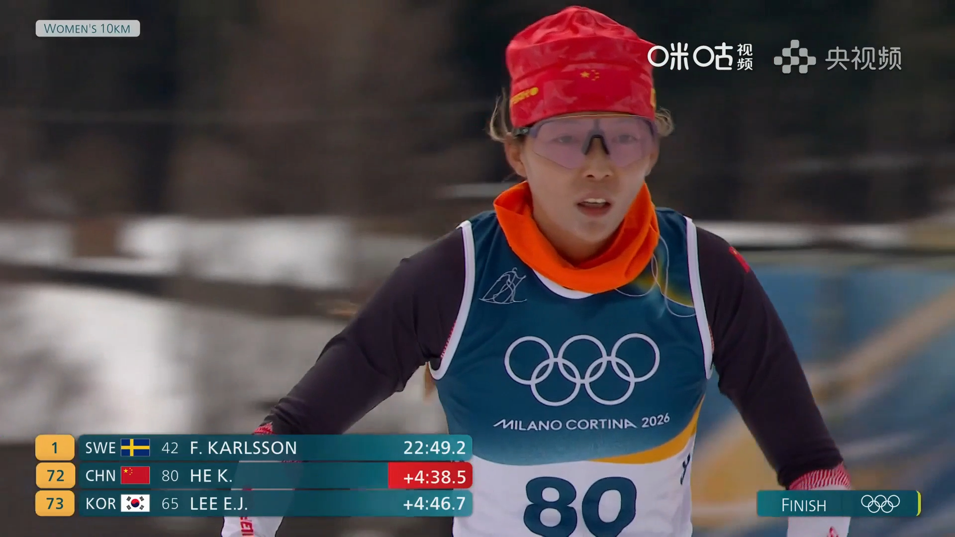 #中国四女将越野滑雪10公里完赛#米兰冬奥会越野滑雪女子10公里间隔出发自由技术