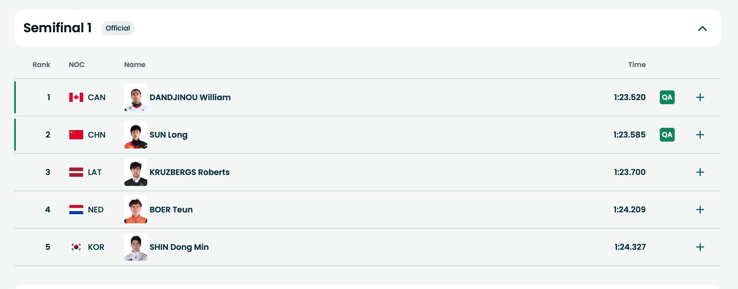 在第一组中,孙龙滑出1分23秒585排名小组第二率先晋级决赛。