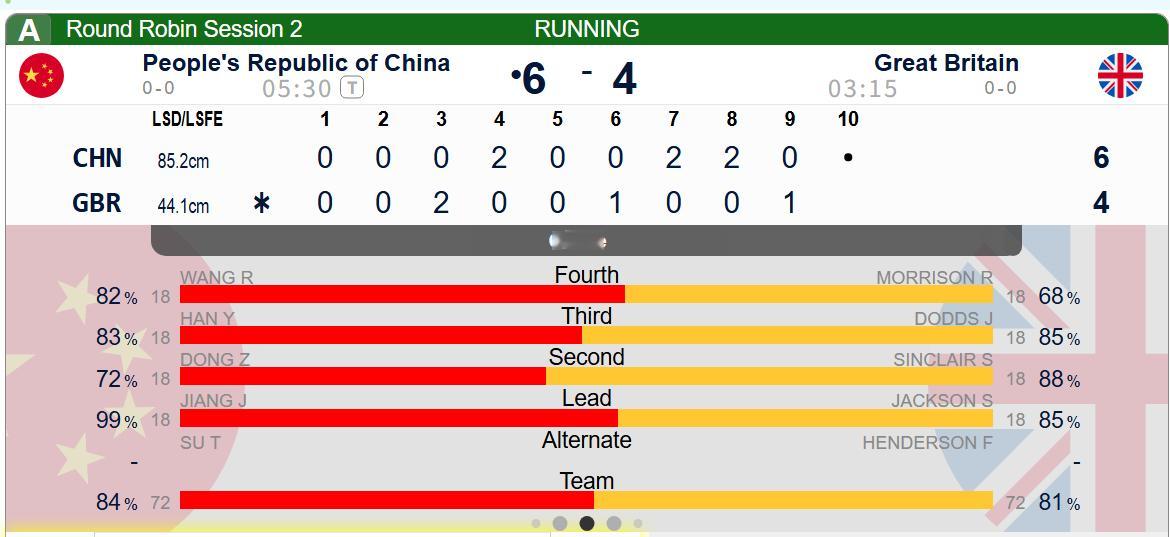 【奥运冰壶】第九局结束 中国6-4英国第十局中国领先两分打后手