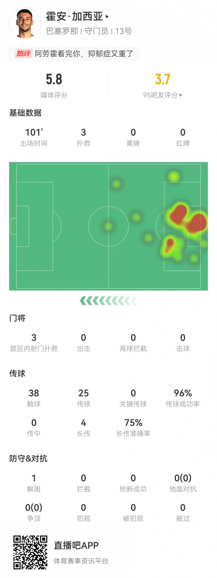 失误送礼!霍安·加西亚本场3扑救1解围+4长传3成功 获评5.8分