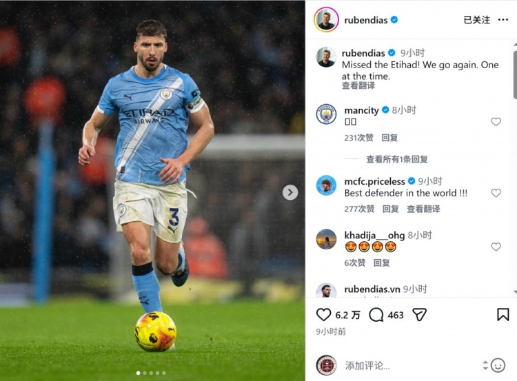 鲁本·迪亚斯伤愈后首次在主场出战,他首发踢满全场,赛后鲁本·迪亚斯社媒写道:“想念伊蒂哈德球场,我们再次出发,一场一场来。”
