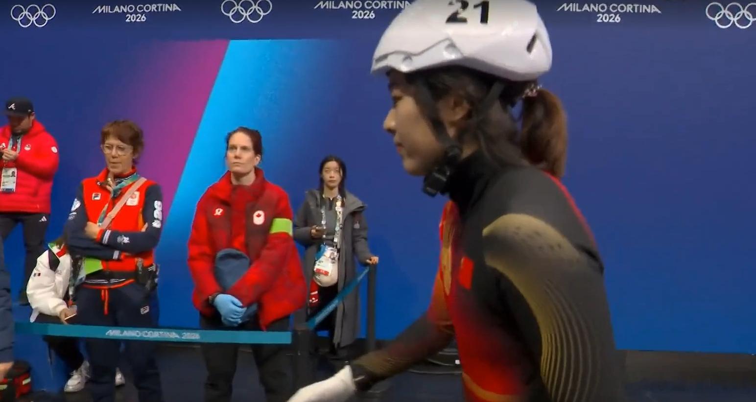 中国选手王欣然在弯道处撞开法国选手被判犯规。