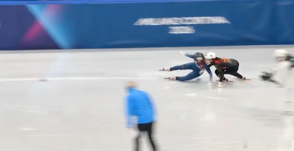 第三组张楚桐上来在弯道处就被两位美国选手撞翻,比赛重开。