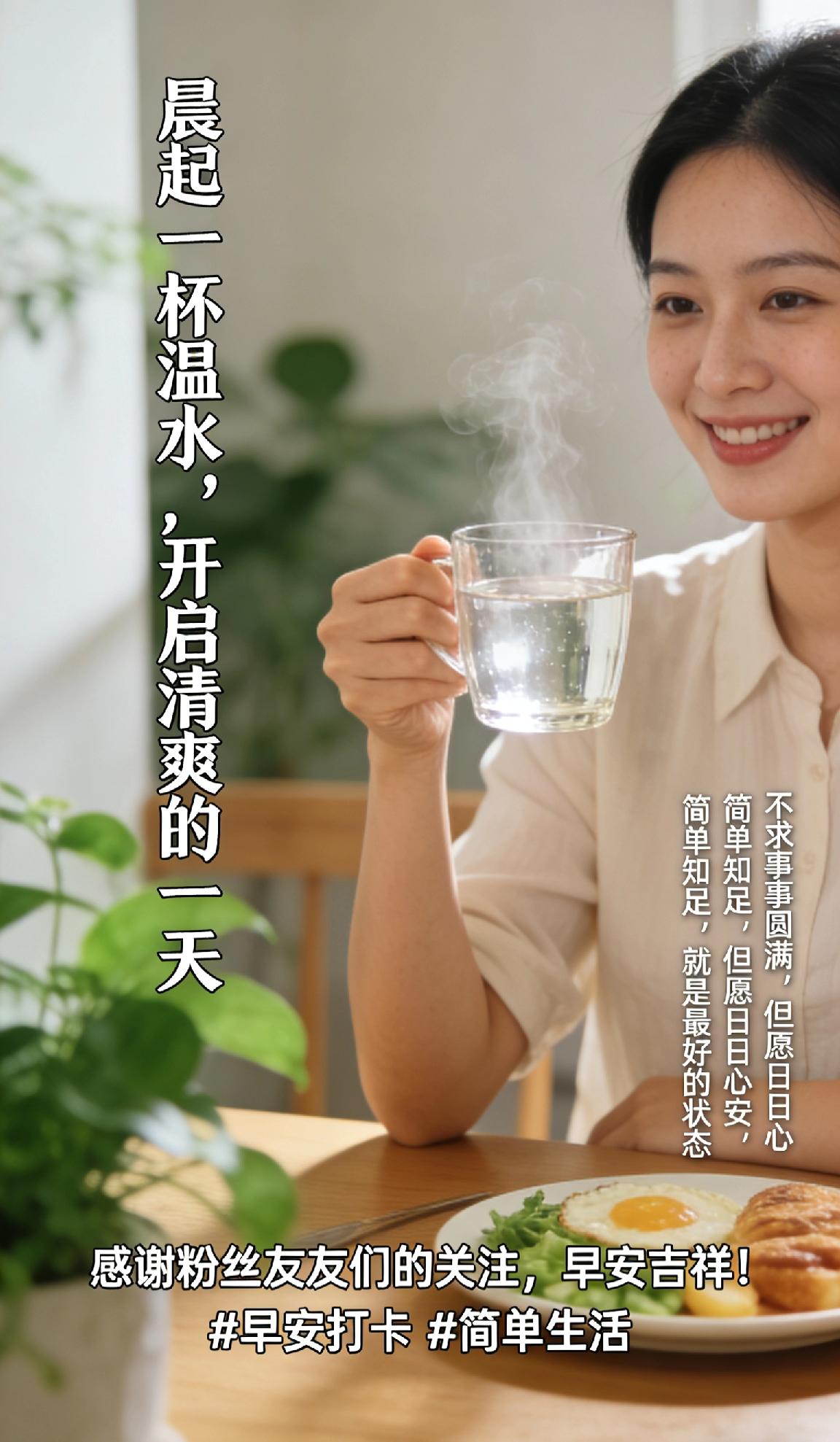 分享早上的祝福语晨起一杯温水,开启清爽的一天。不求事事圆满,但愿日日心安,简单知足,就是最好的状态。感谢粉丝友友们的关注,早安吉祥!早安打卡 简单生活