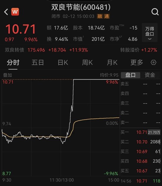 文章发布后,双良节能股价于2月12日13时26分起至收盘均封涨停板,报收10.71元/股,成交额17.62亿元,至收盘仍有超21万手买单封住涨停板。
