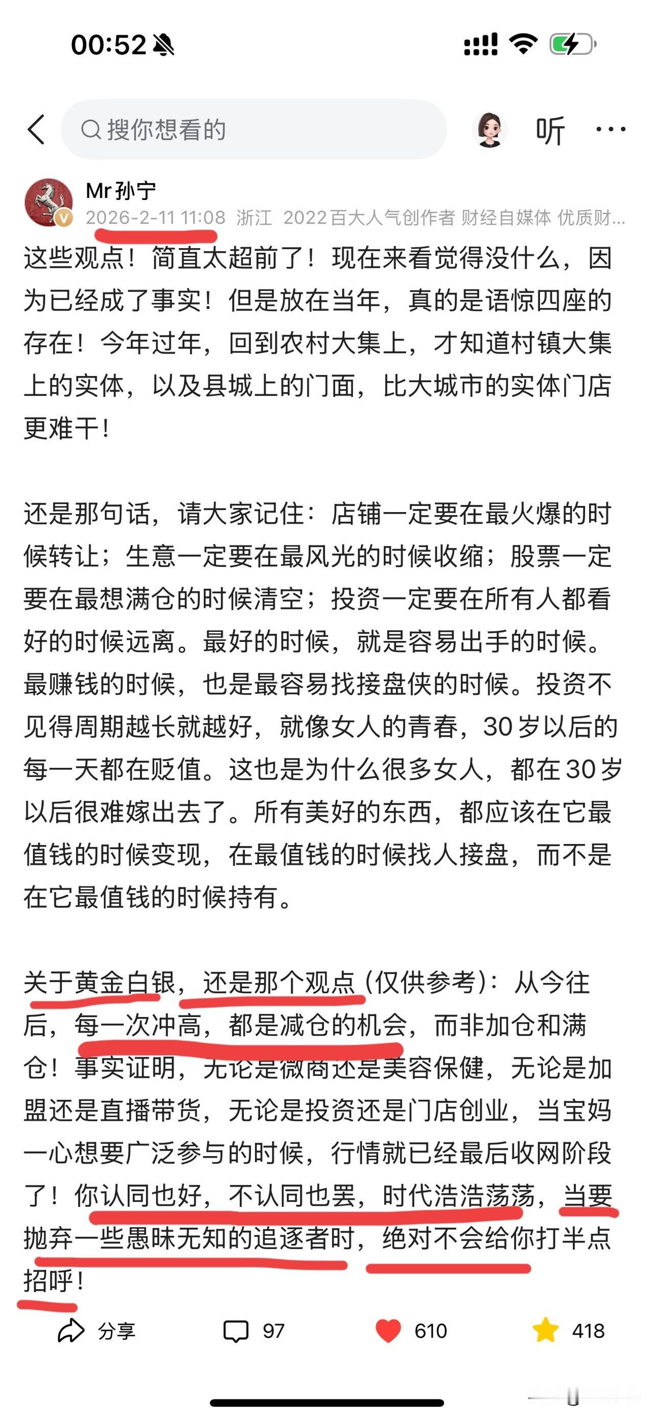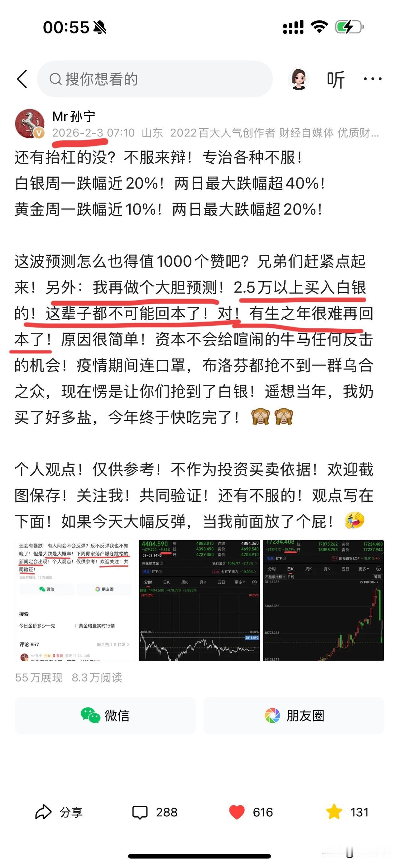 现在买黄金的人,你们自己看看这个走势图。到底是在赌博,还是在投资。既然你选择了赌博,你就要想到自己早晚会有跳楼的那一天。如果你选择投资,你们看看这到底是洼地,还是危墙!2026年以后的黄金和白银!每一次冲高!对投资人而言都是一次救赎!每一次冲高,都是为囚徒打开了一扇大门!如果还有人觉得现在冲进去是捡到宝了!那么这些人,真和当年打死也要去缅北发财的那些傻杯没任何区别了!唉~好言难劝该死的鬼!认为小孙说的对的,转发扩散吧!这种走势,扭头向下的时候不可能有任何缓冲的,真的要埋一大片! 昨夜黄金白银继续暴跌!白银又暴跌超10%!