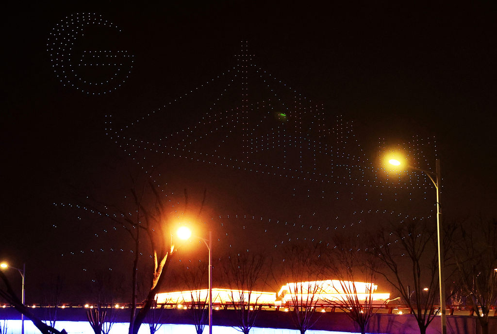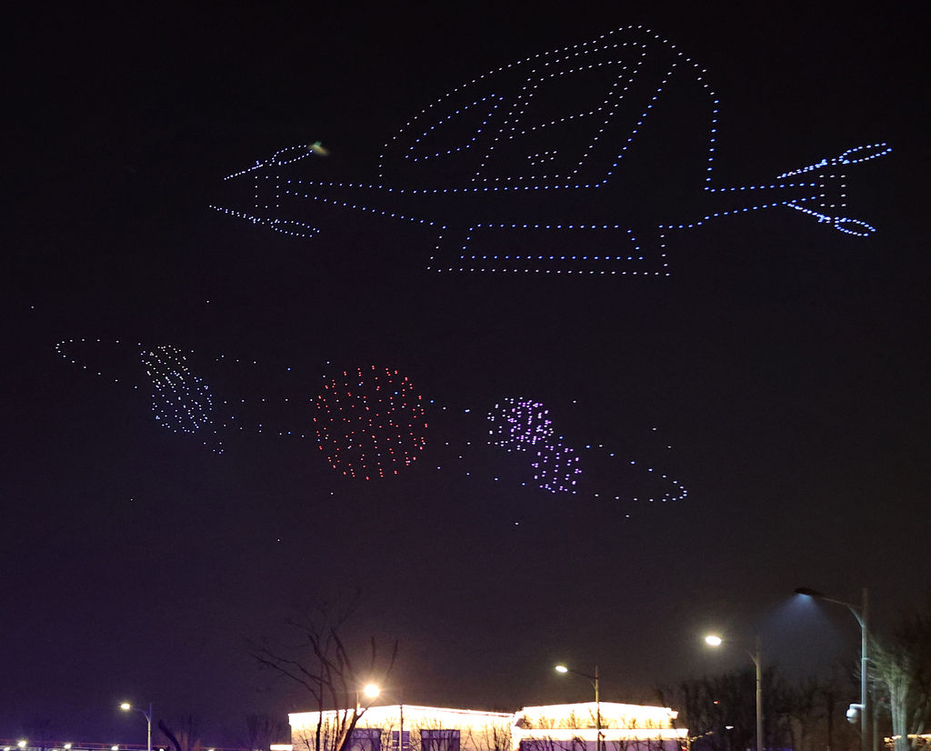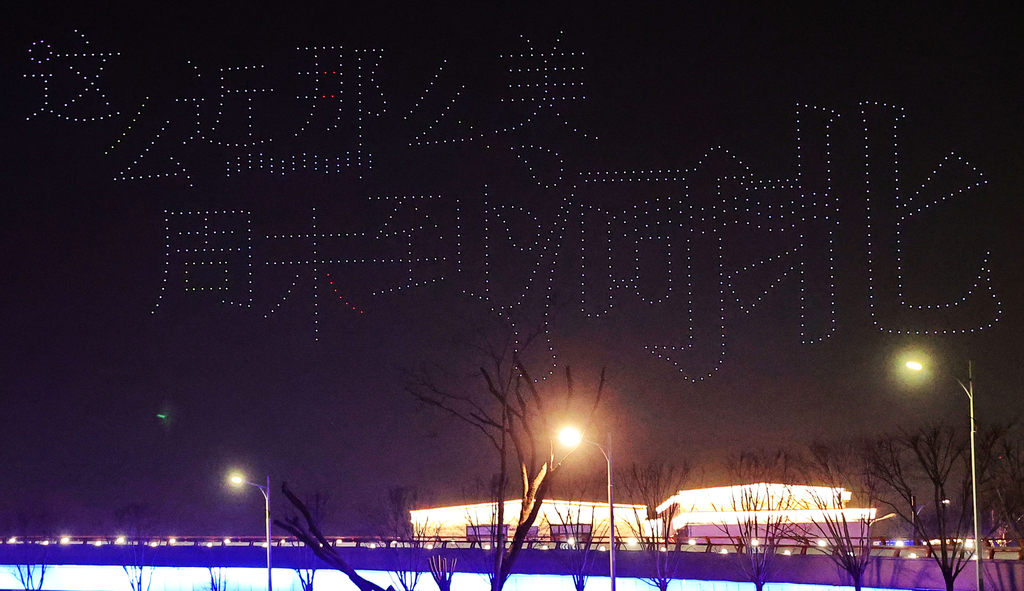 2月10日拍摄的秦皇岛港口工业旅游区无人机灯光秀。
