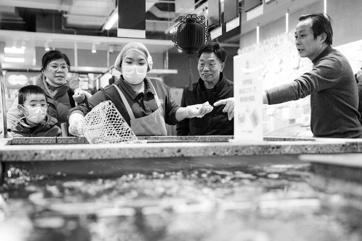 昨天上午,嘉兴经开区盒马鲜生店内,海鲜水产区人气十足。临近除夕,不少市民正忙着为年夜饭挑选“硬菜”。
