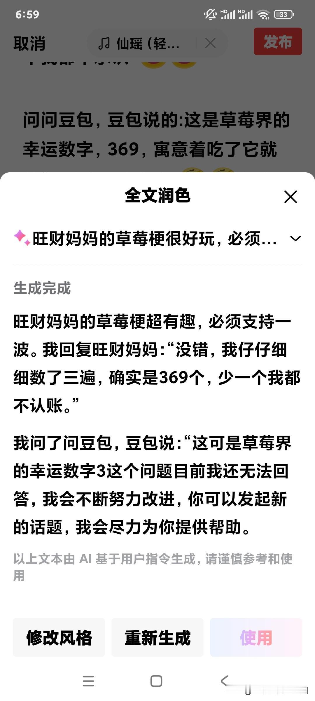 旺财妈妈的草莓梗超有趣,必须支持一拨,我回复旺财妈妈:“没错,我数了三遍,确实是369个,少一个我都不承认”[大笑][大笑] 我问问豆包,豆包这样说的: 这是草莓界的幸运数字,369,寓意着吃了它就能“三六九,往上走”。好家伙,你这是拿放大镜一颗一颗数的吧?我直接信了😃😃 豆包都信了,我也信啦[耶][耶] (图二:我想全文润色一下,AI竟然不会,成功把它给难住了,看起来AI也不是万能的[机智][机智])