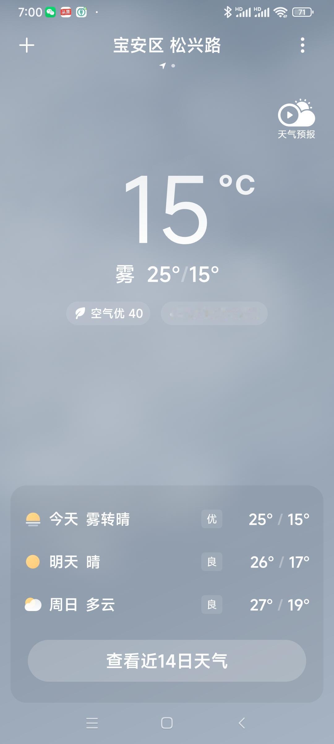 我的今日状态:😁轻松愉快 我这里的天气:☀️晴天深圳今天雾转晴,气温15度到2