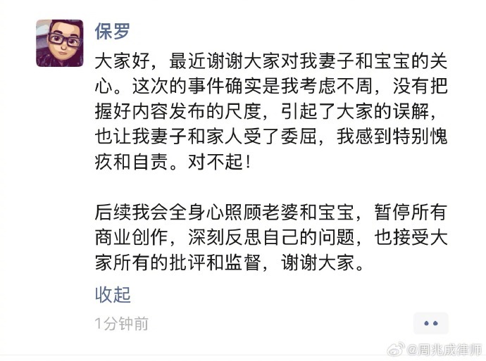 声明中称:“首先,我们由衷理解网友对本次事件的高度关注,也完全认同大家对于女性生育权益保护、隐私边界界定以及亲密关系中彼此呵护的美好期待。网友们的各类声音,本质上是对生育这一特殊人生时刻的尊重,更是对公序良俗的坚守,这份心意,委托人保罗先生及其妻子深感认同,也十分感念。需要特别说明的是,保罗先生及其妻子承认在本次内容创作与发布过程中,确实存在“内容尺度把握、隐私边界考量等细节考虑不周”,让大家产生误解。对此,我们深感愧疚与歉意,也进行了深刻的反思。”