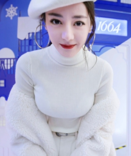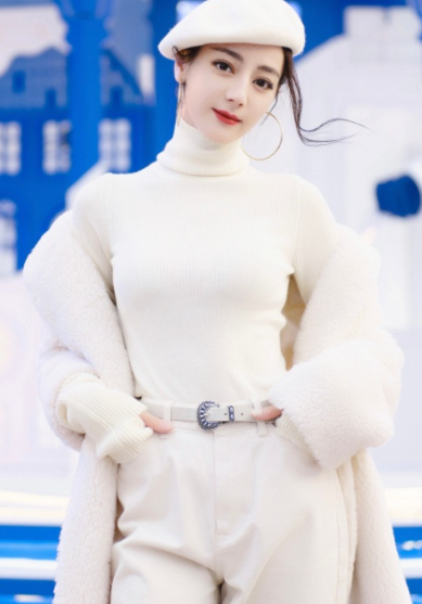 迪丽热巴白色为主色调的穿搭尽显温柔气质,上身是简约高领白毛衣,柔软质地尽显“奶呼