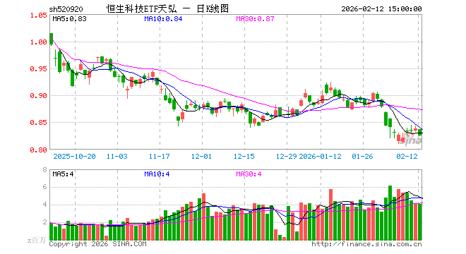2月12日,恒生科技ETF天弘(520920)跌1.43%,成交额3.41亿元。当日份额增加2.00亿份,最新份额为182.06亿份,近20个交易日份额增加39.97亿份。最新资产净值计算值为150.02亿元。