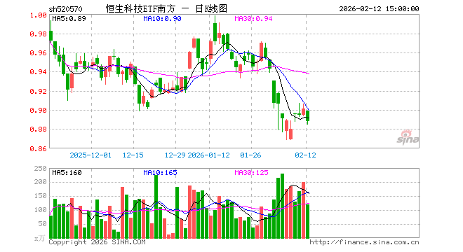 2月12日,恒生科技ETF南方(520570)跌1.44%,成交额1.06亿元。当日份额增加1700.00万份,最新份额为32.05亿份,近20个交易日份额增加4.60亿份。最新资产净值计算值为28.50亿元。