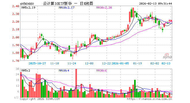 2月13日,云计算50ETF新华(560660)开盘跌0.72%,报2.199元。云计算50ETF新华(560660)重仓股方面,新易盛开盘跌1.02%,中际旭创跌0.66%,中科曙光跌1.22%,金山办公跌0.96%,浪潮信息跌1.95%,紫光股份跌0.86%,恒生电子跌0.39%,拓维信息跌0.15%,润和软件跌0.22%。