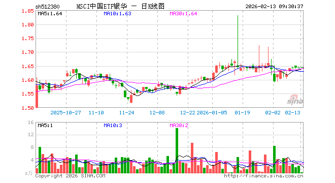 2月13日,MSCI中国ETF(512380)开盘涨0.06%,报1.645元。MSCI中国ETF(512380)重仓股方面,贵州茅台开盘涨0.00%,宁德时代跌0.07%,招商银行跌0.10%,工业富联跌1.59%,中国平安跌0.59%,紫金矿业跌3.75%,长江电力涨0.04%,中际旭创跌0.66%,农业银行涨0.30%,寒武纪跌1.12%。