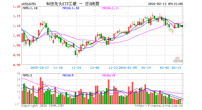 2月13日,科技龙头ETF工银(516050)开盘跌0.09%,报1.103元。科技龙头ETF工银(516050)重仓股方面,中际旭创开盘跌0.66%,新易盛跌1.02%,恒瑞医药涨0.03%,中芯国际跌0.30%,药明康德跌0.01%,海光信息跌0.89%,北方华创涨1.00%,胜宏科技跌0.65%,京东方A跌0.47%,兆易创新涨0.00%。