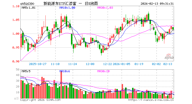 2月13日,新能源车ETF汇添富(516390)开盘跌0.39%,报1.022元。新能源车ETF汇添富(516390)重仓股方面,比亚迪开盘跌1.22%,宁德时代跌0.07%,汇川技术跌0.40%,三花智控跌0.99%,华友钴业跌3.42%,亿纬锂能跌0.12%,赣锋锂业跌2.72%,天赐材料跌1.10%,长安汽车跌0.18%,天齐锂业跌1.23%。