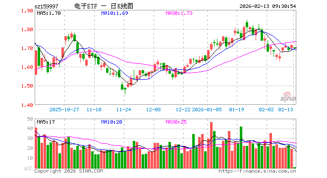 2月13日,电子ETF(159997)开盘跌0.76%,报1.701元。电子ETF(159997)重仓股方面,立讯精密开盘跌1.03%,寒武纪跌1.12%,工业富联跌1.59%,中芯国际跌0.30%,海光信息跌0.89%,北方华创涨1.00%,胜宏科技跌0.65%,京东方A跌0.47%,兆易创新涨0.00%,澜起科技跌0.78%。